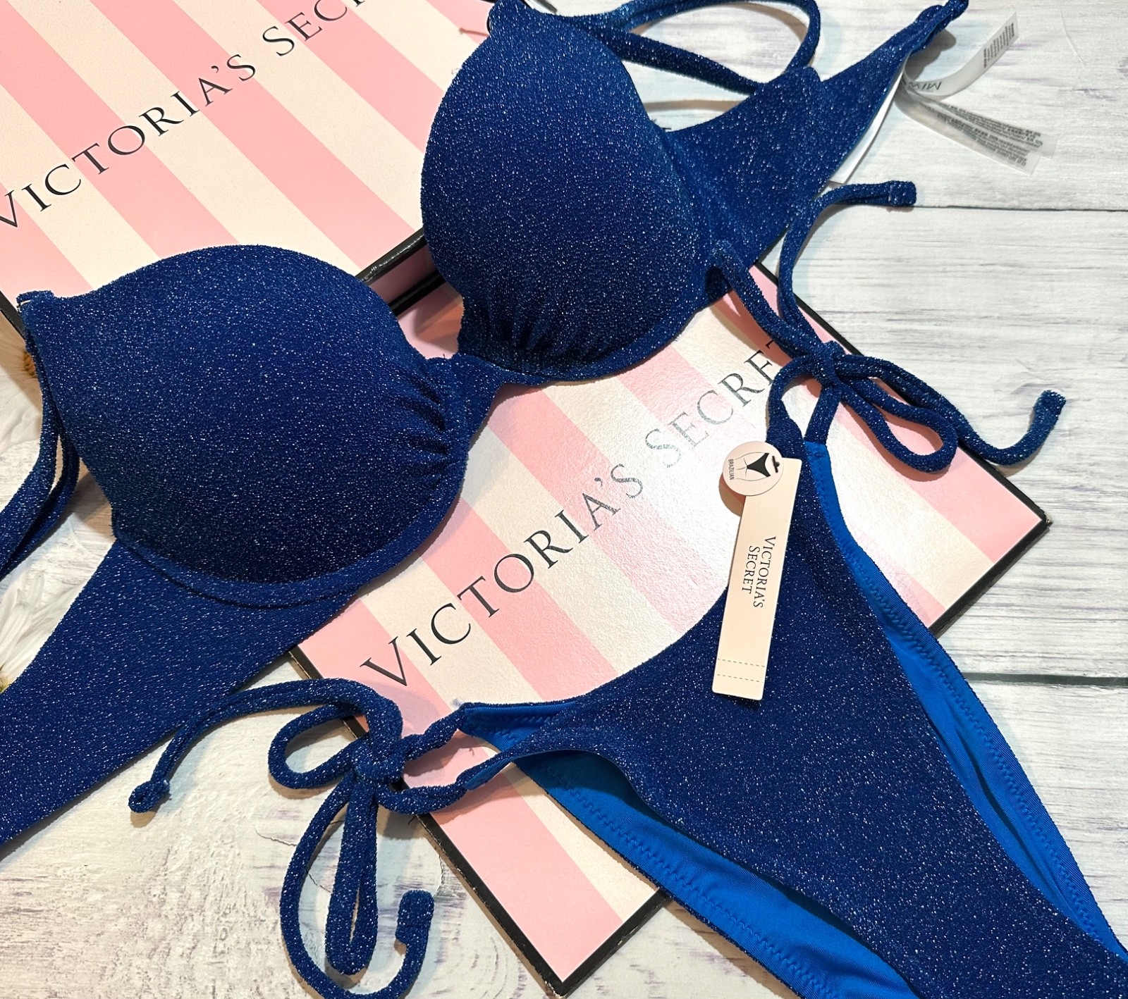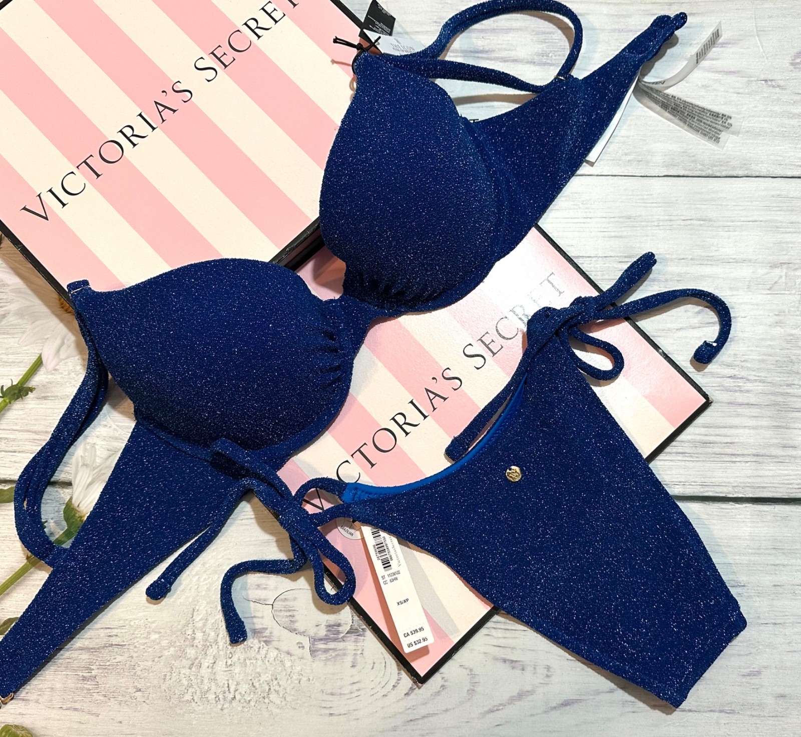 как выглядит Victoria s Secret Swim Shimmer Icon Push-Up Bikini Side Tie Brazilian Set Blue фото