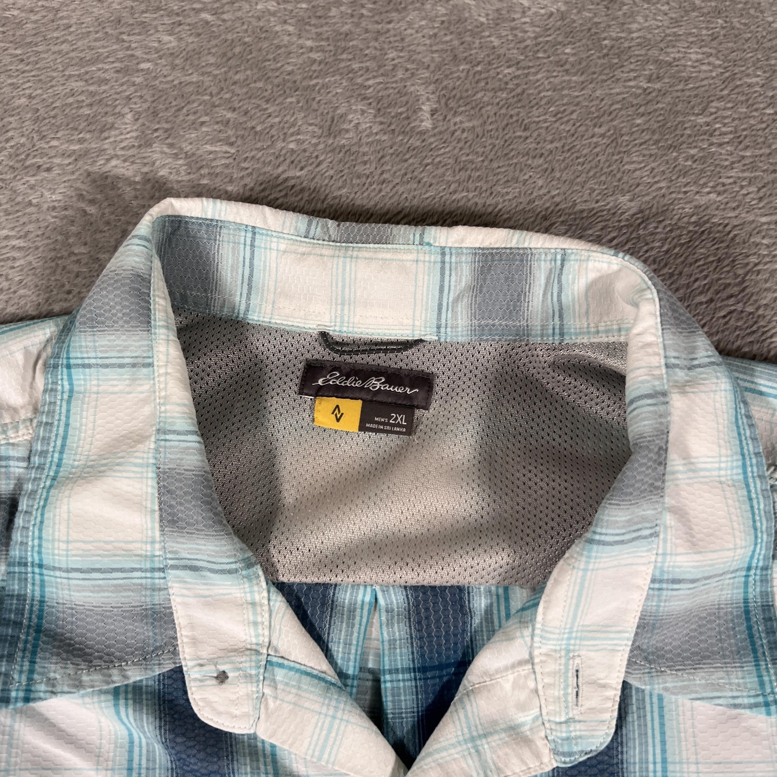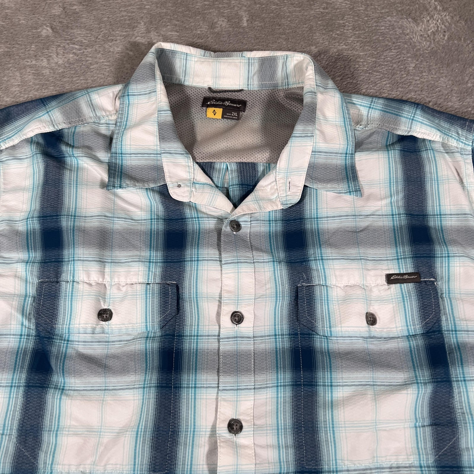как выглядит Eddie Bauer Travex Shirt Mens 2XL White Blue Plaid Short Sleeve Button Vented фото
