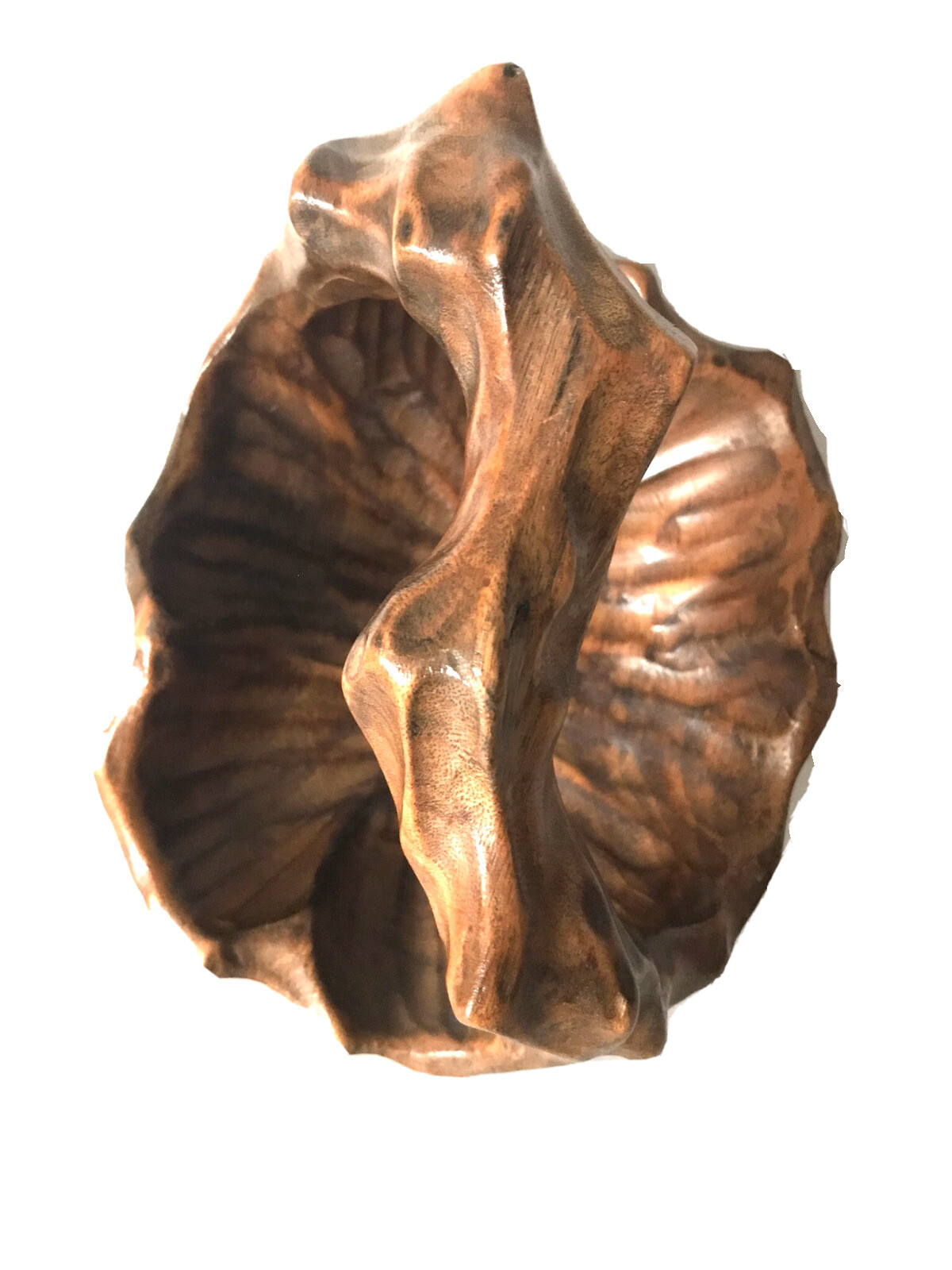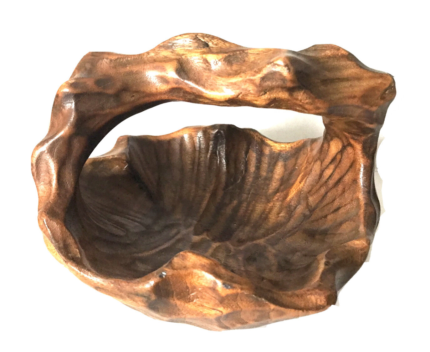 • Vtg BURL WOOD Bowl Basket Hand Carved Handle Primitive Art Boho Rustic Farmhouse