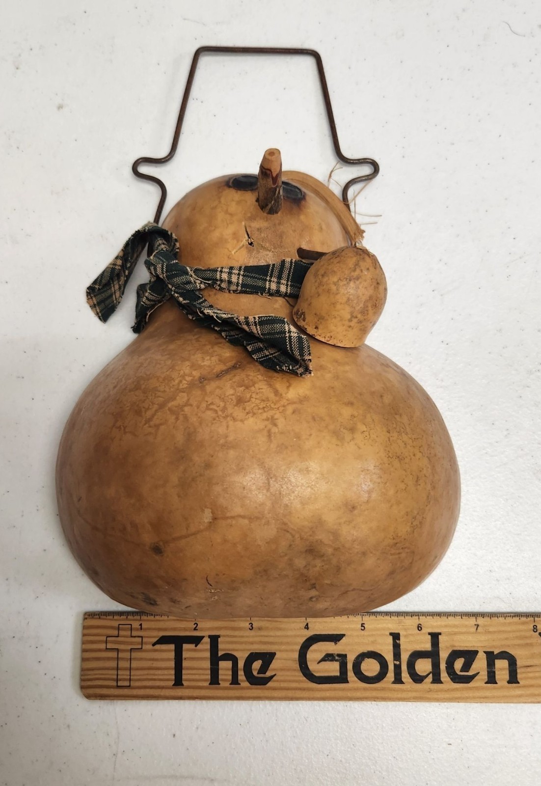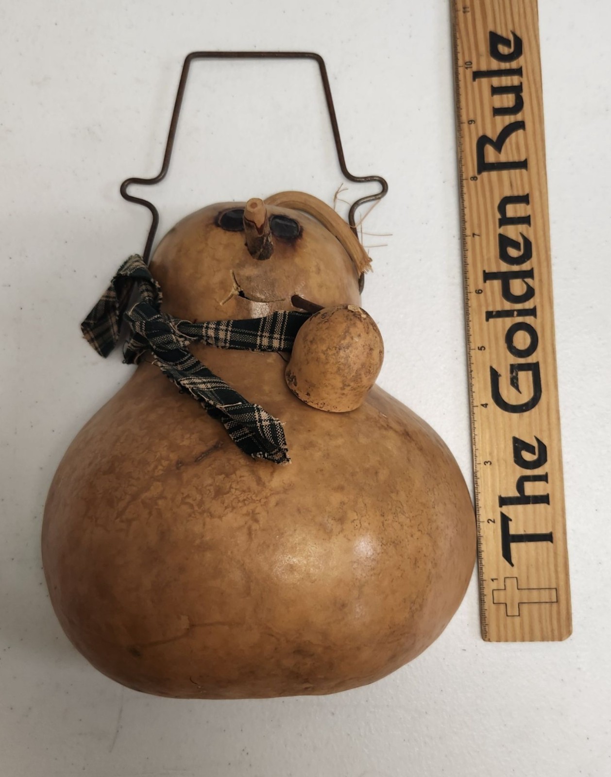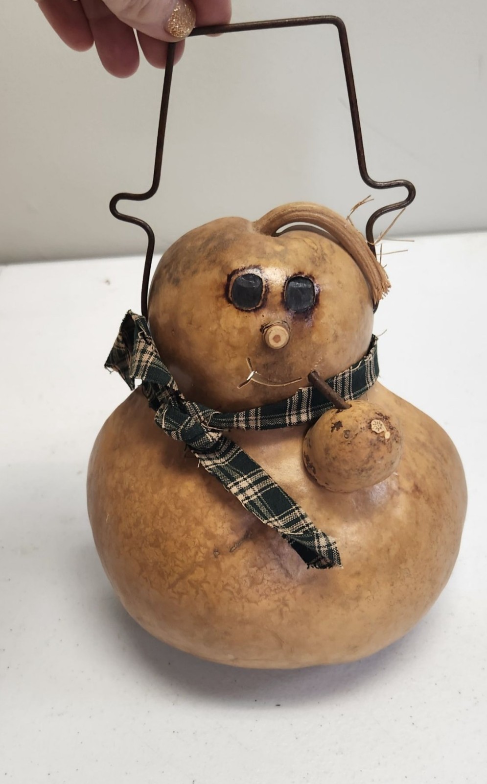 • Handcrafted Gourd Snowman With Plaid Scarf Wire Handle Rustic Winter Decor