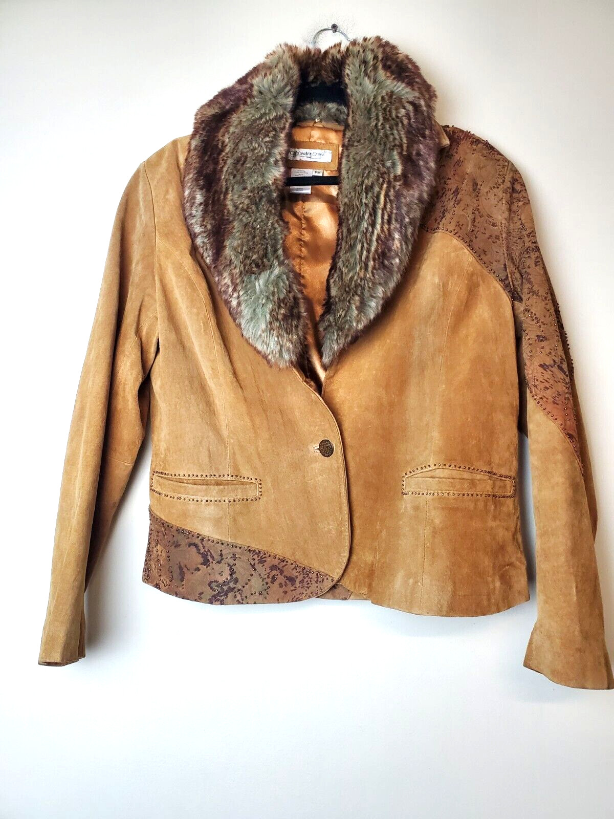 MOB WIFE Women JACKET Fur Collar Brown Leather Medium P Tan Beaded Vintage Penny