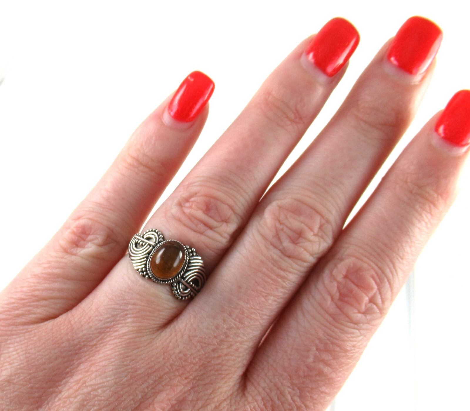 .925 Sterling Silver Amber Statement Ring Unique Modernist Swirls Unusual 5.75
