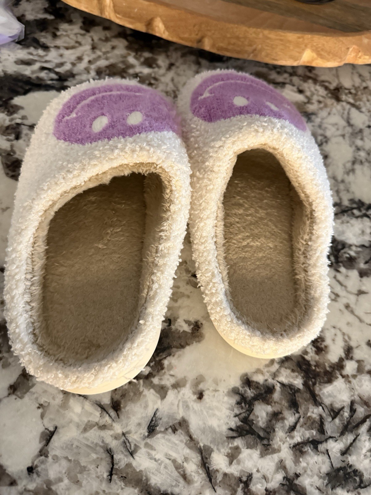 как выглядит Plush Fuzzy Purple Smiley Face Slippers House Shoes Size 2 фото