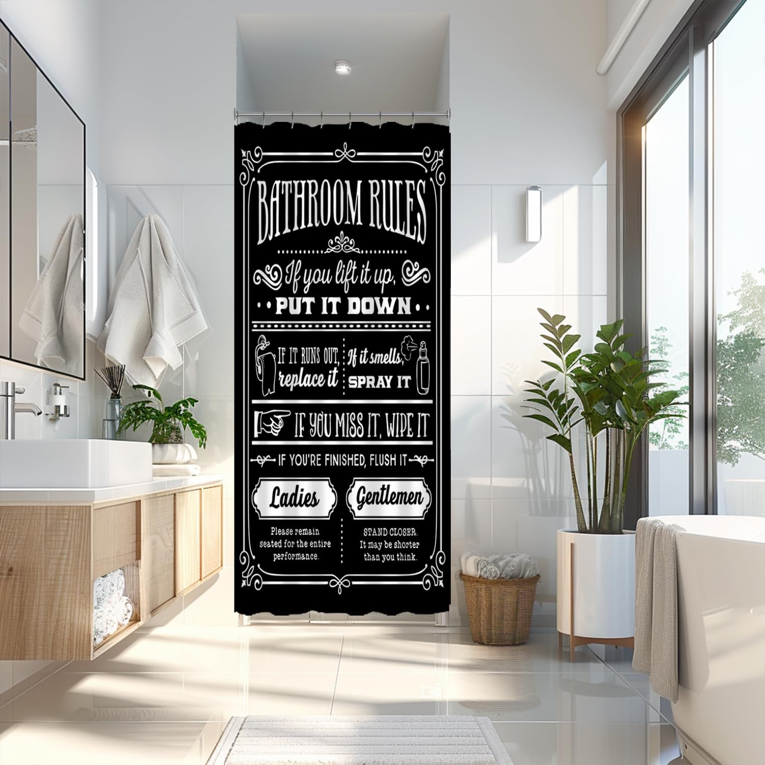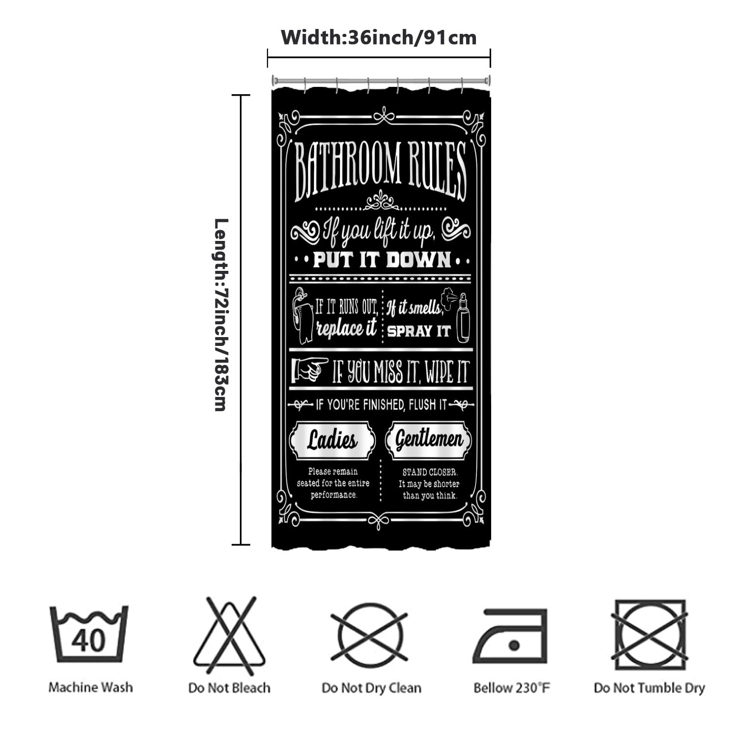 Funny Quotes Shower Curtain 36 x 72, Black, White, Bathroom Rules, Waterproof
