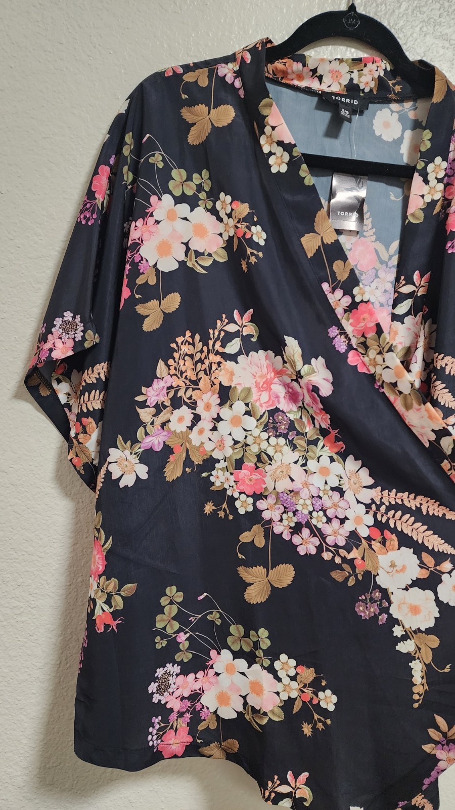 как выглядит Torrid Womans Short Sleeved Black Floral Open Front Short Kimono Cover Up Sz 2/3 фото