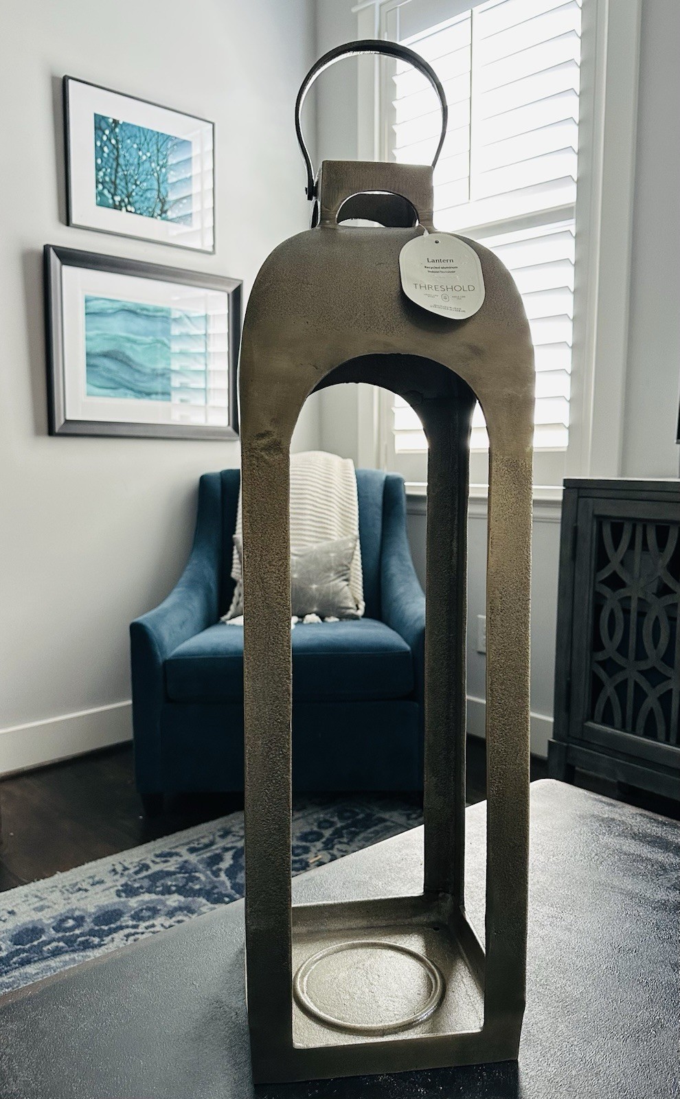 как выглядит Threshold 29" PILLAR CAST ALUMINUM LANTERN CANDLE HOLDER Gold TARGET Home Decor фото