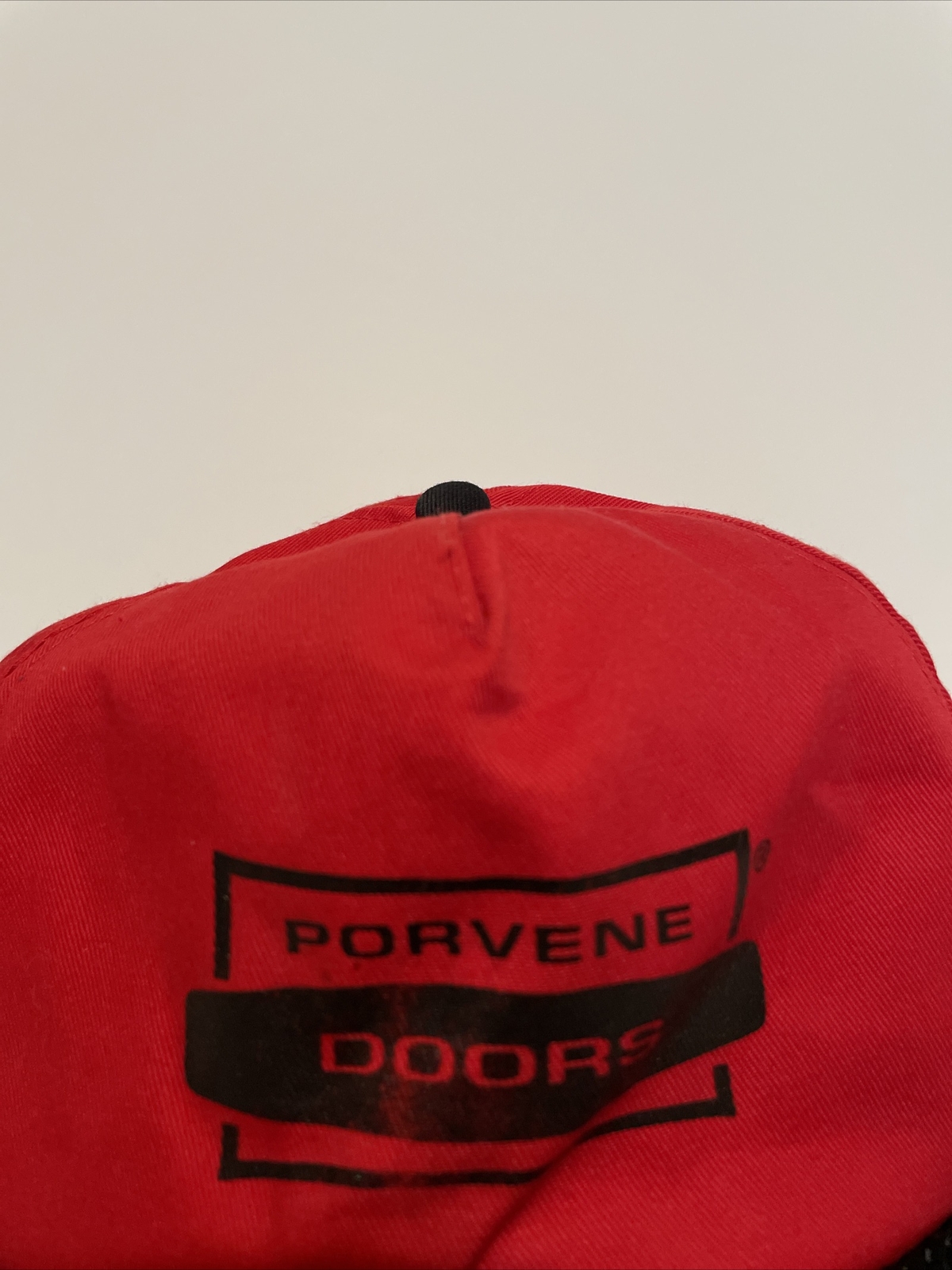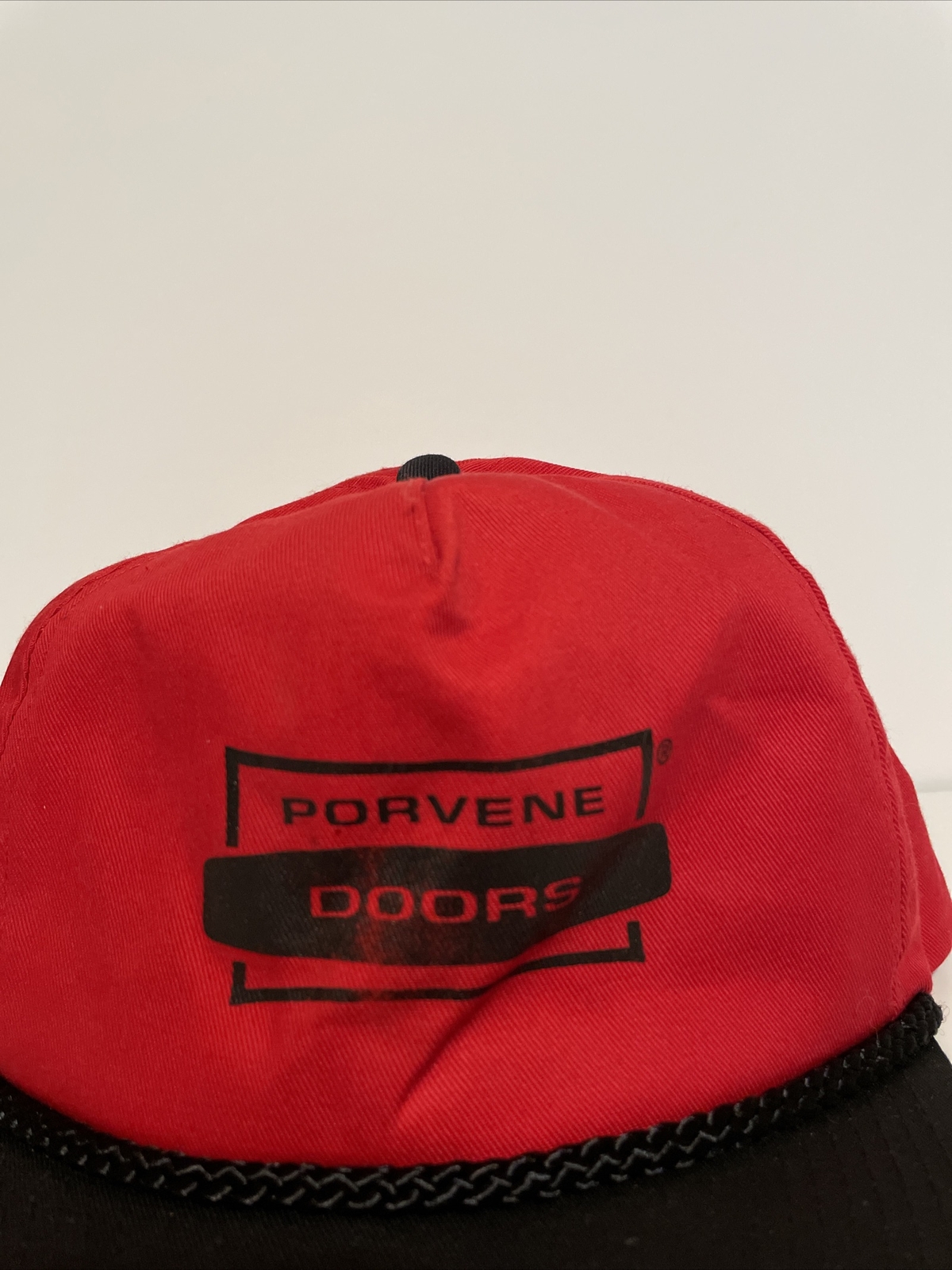 Vintage 1980s PORVENE DOORS Advertising Red Black Snapback Trucker Hat