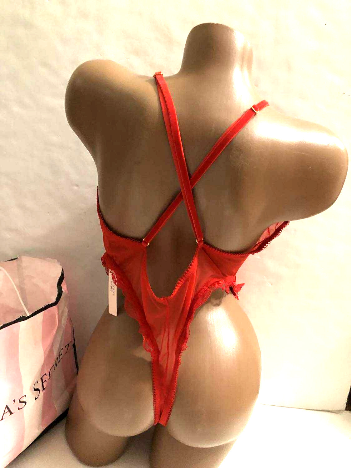 как выглядит Victorias Secret Mesh Embroidery Bow Plunge Teddy Lace Bodysuit Red XXL NWT фото