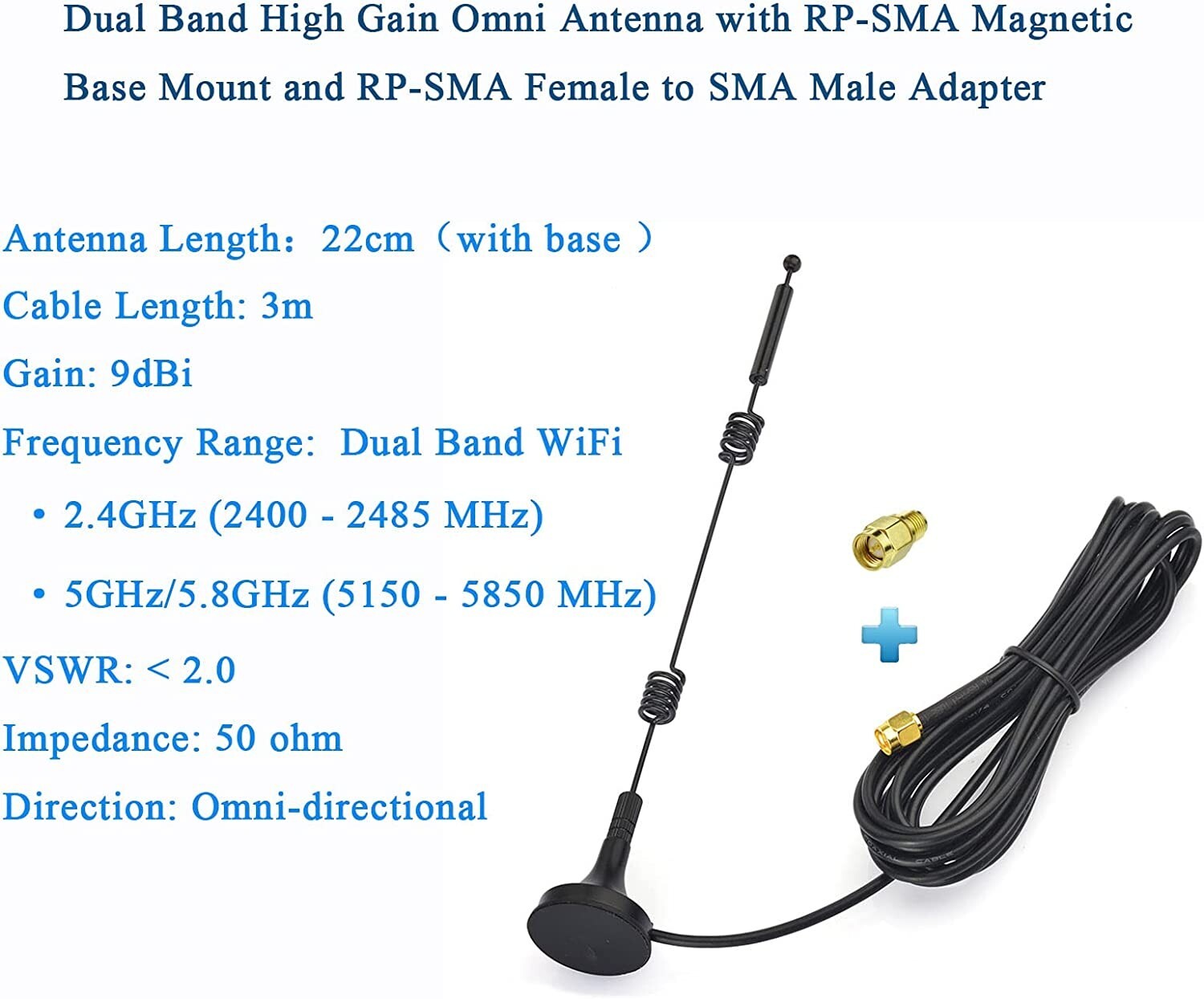WiFi Antenna Kit Dual Band Omni Antenna SMA RP-SMA Male Magnetic Base Mount