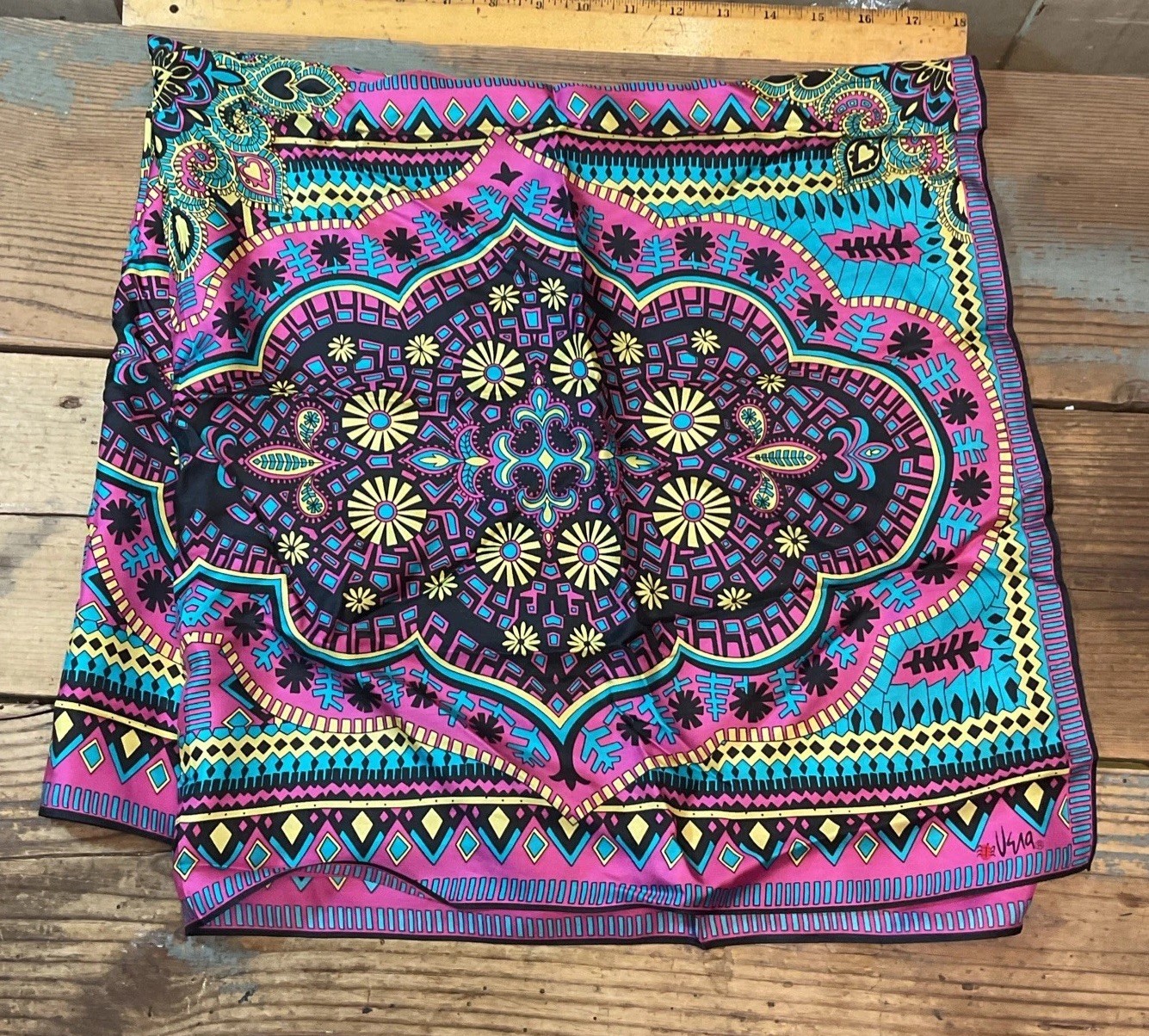 Vera, Silk Scarf, 33 Square, Geometric Paisley, Pink, Teal Yellow, As Found