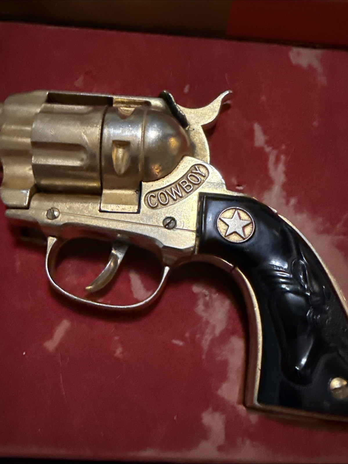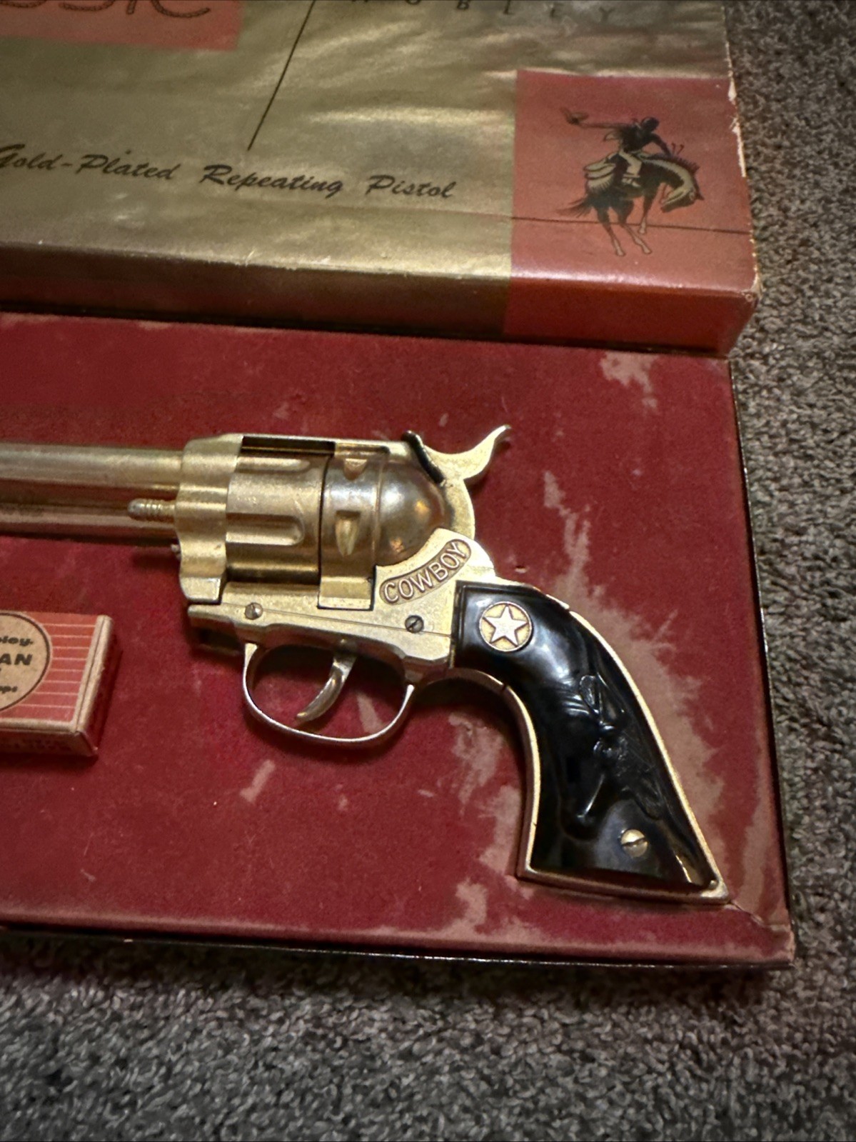 как выглядит VINTAGE 1952 HUBLEY CLASSIC COWBOY REPEATING GOLD PISTOL CAP GUN In Box фото