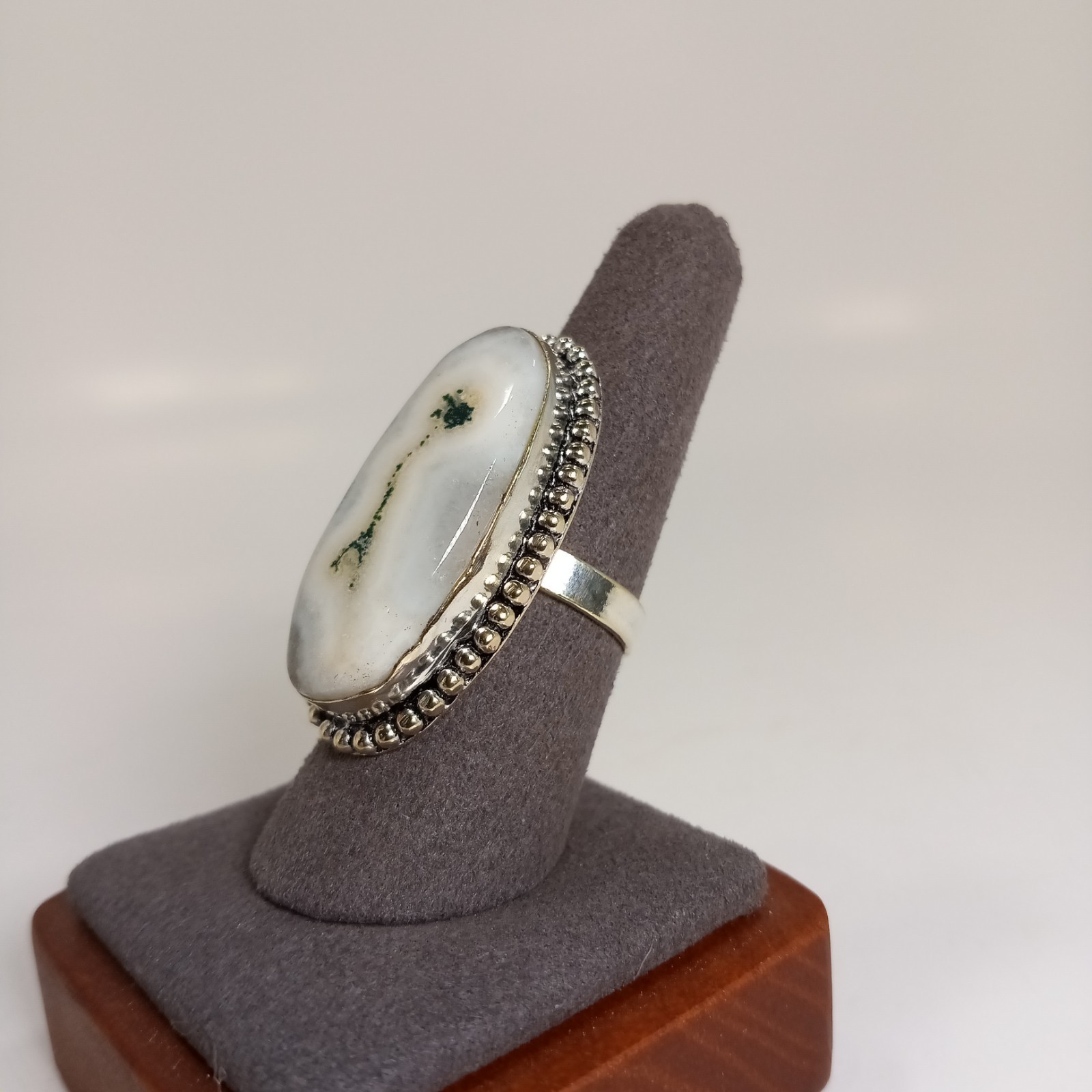 Sterling Silver 925 Large Oval White Green Moss Agate Ring Size 8