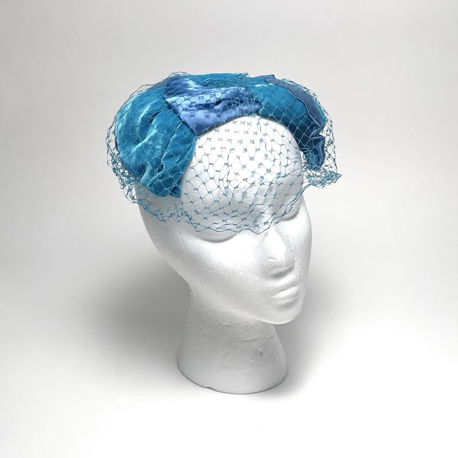 Vintage Bright Blue Velvet Satin Fascinator Hat With Face Netting Church Derby