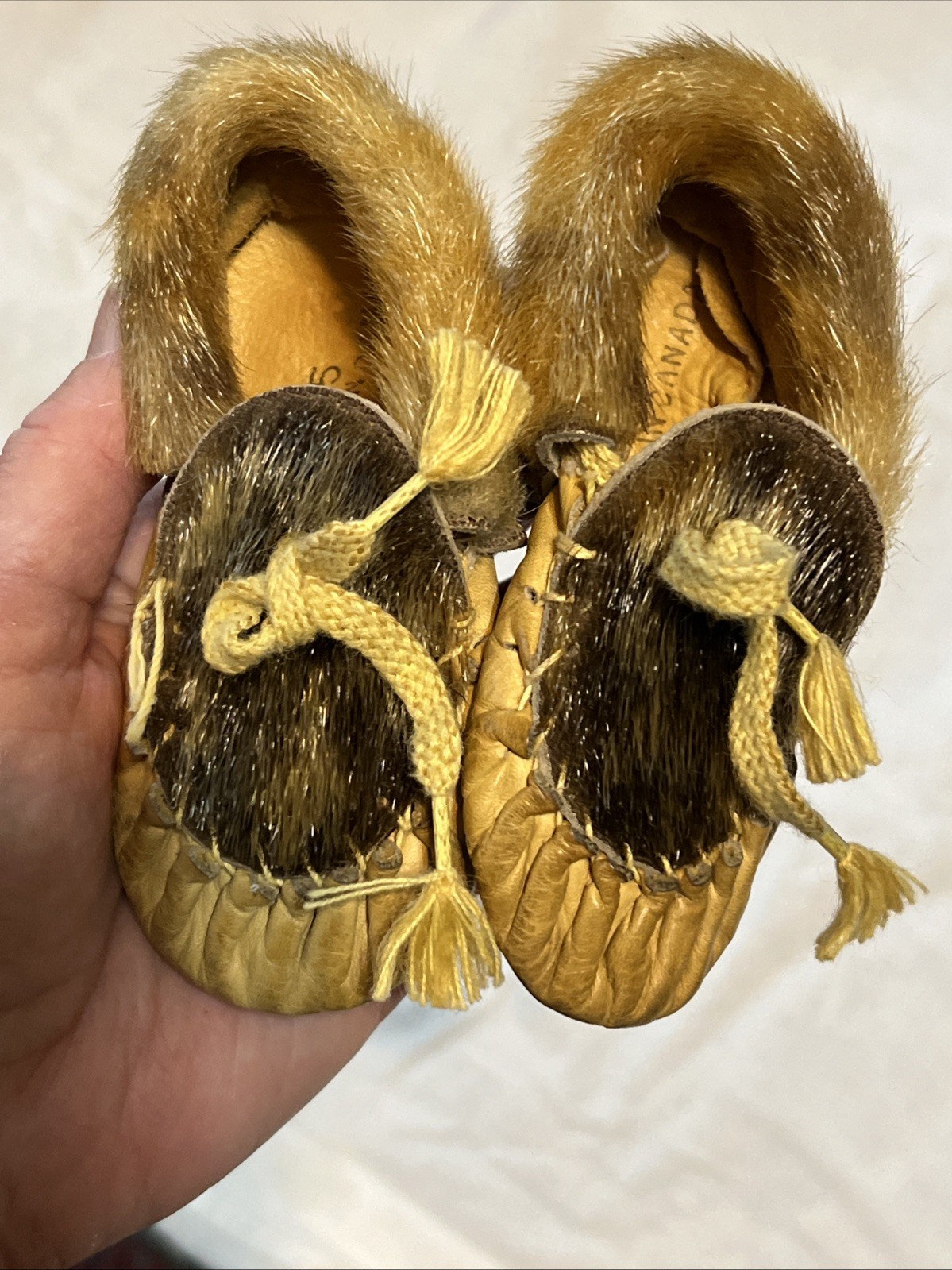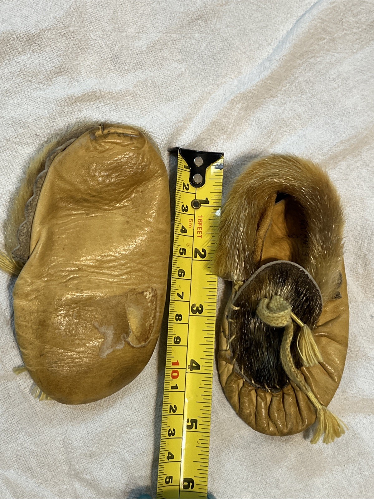 как выглядит Vintage Handmade Childs Moccasins Baby/ Toddler Leather Decorated W Fur Accents фото