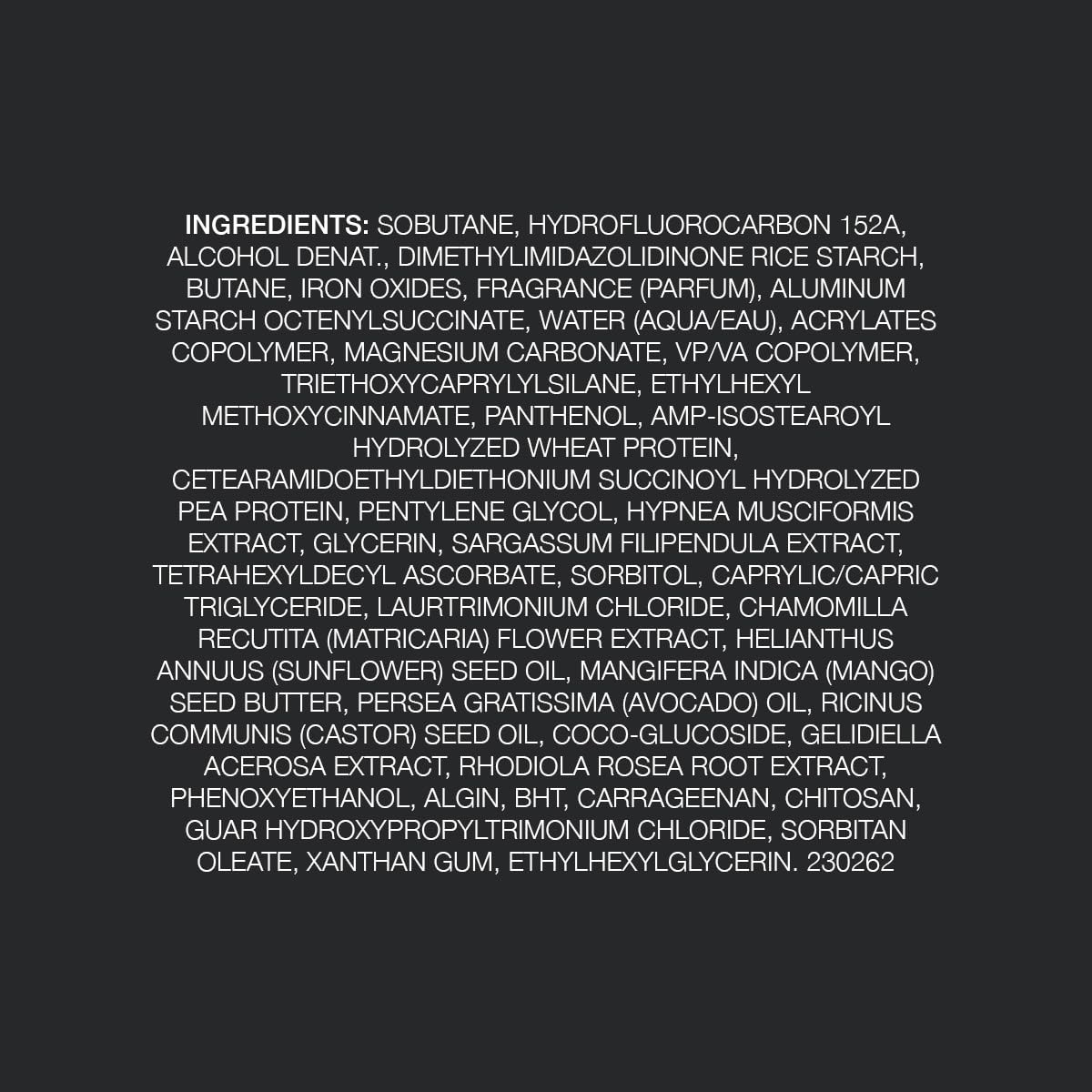 Ingredients: Isobutane. Propane, Alcohol Denat., Dimethylimidazolidinon..