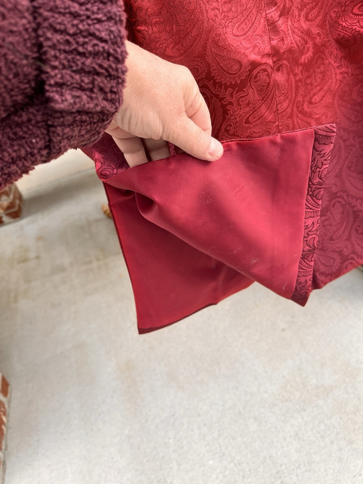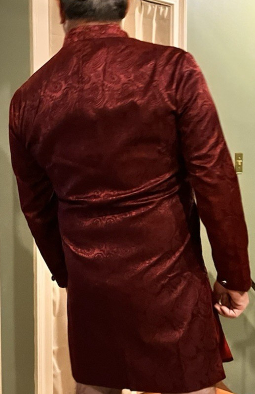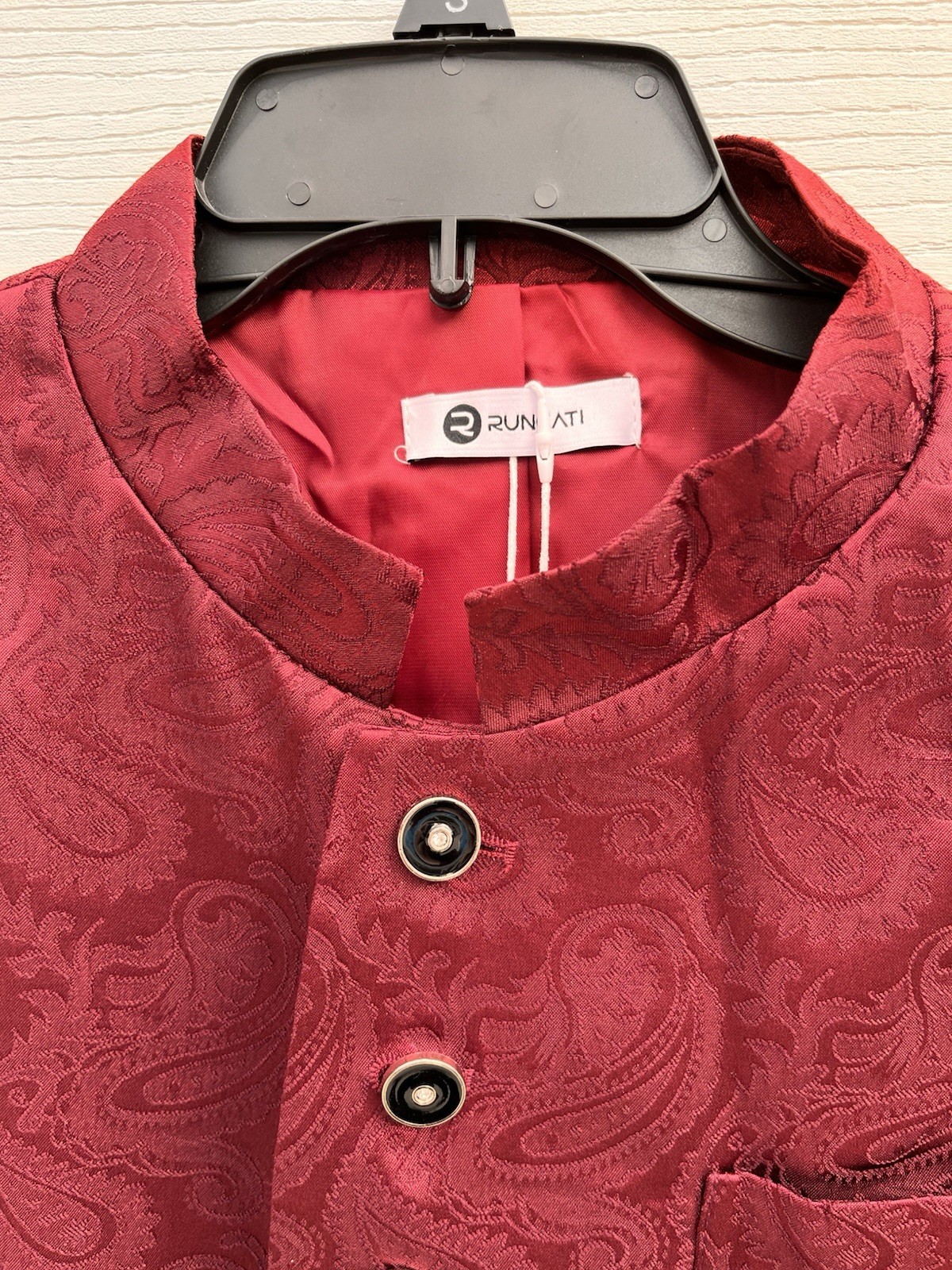 как выглядит Men s Maroon Pure Cotton Kurta Paisley Embroidered Mandarin Collar Long Sleeve фото
