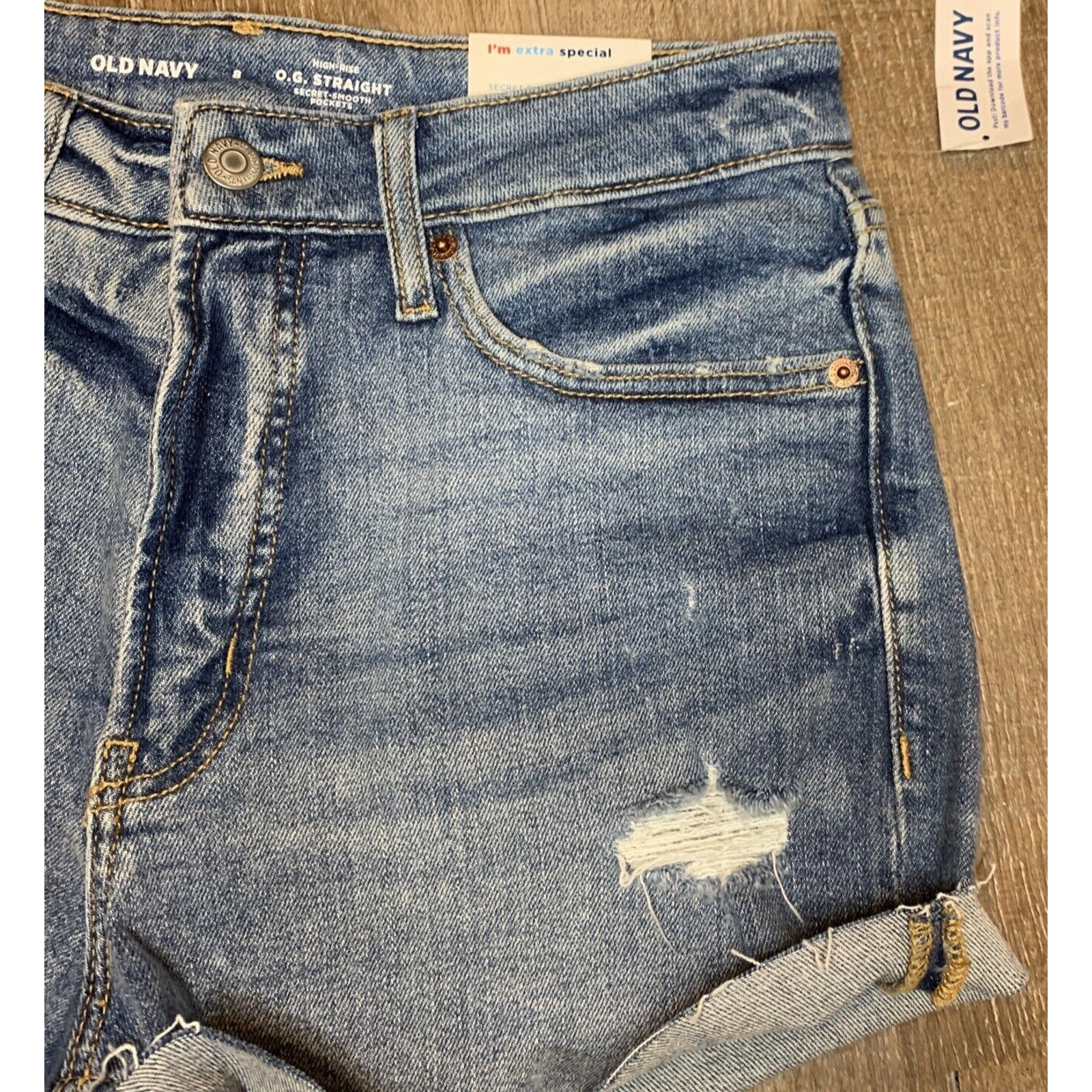 как выглядит Old Navy SZ 8 High Rise Jean Shorts Blue O.G. Distressed NWT S181 фото