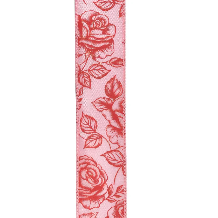 Pink Satin Glitter Ribbon Dusty Red Roses Floral Wired 1.5 x 10 Yards