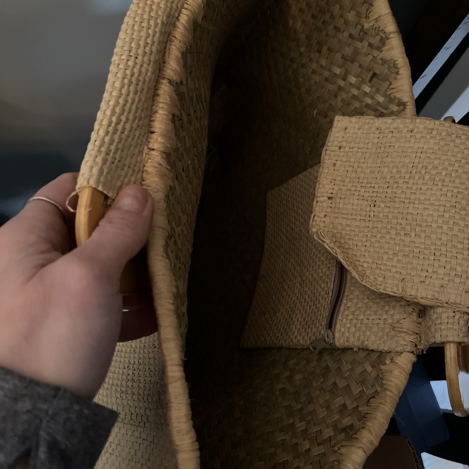 как выглядит Vintage Women s Woven Straw Handbag With Wooden Handles Snap Close Boho фото