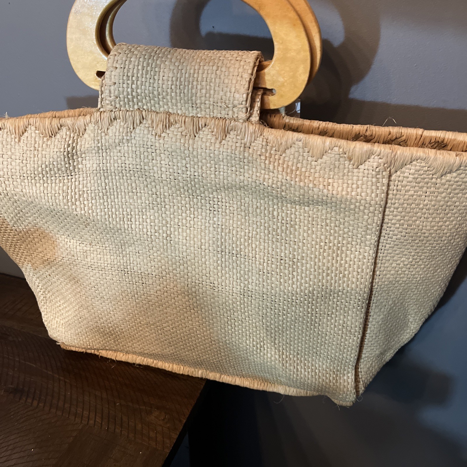 Vintage Women s Woven Straw Handbag With Wooden Handles Snap Close Boho