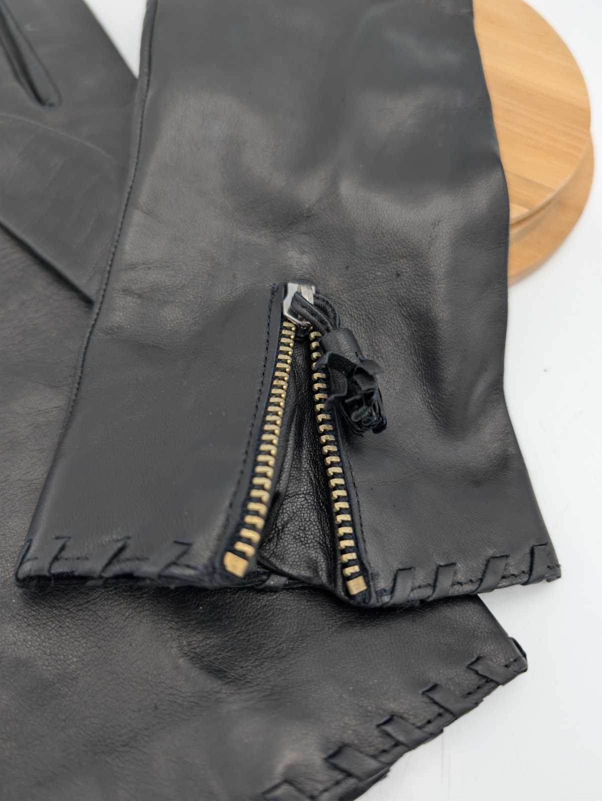 как выглядит Vintage Black Leather Womens Gloves w/Leather Trim and Zippers фото