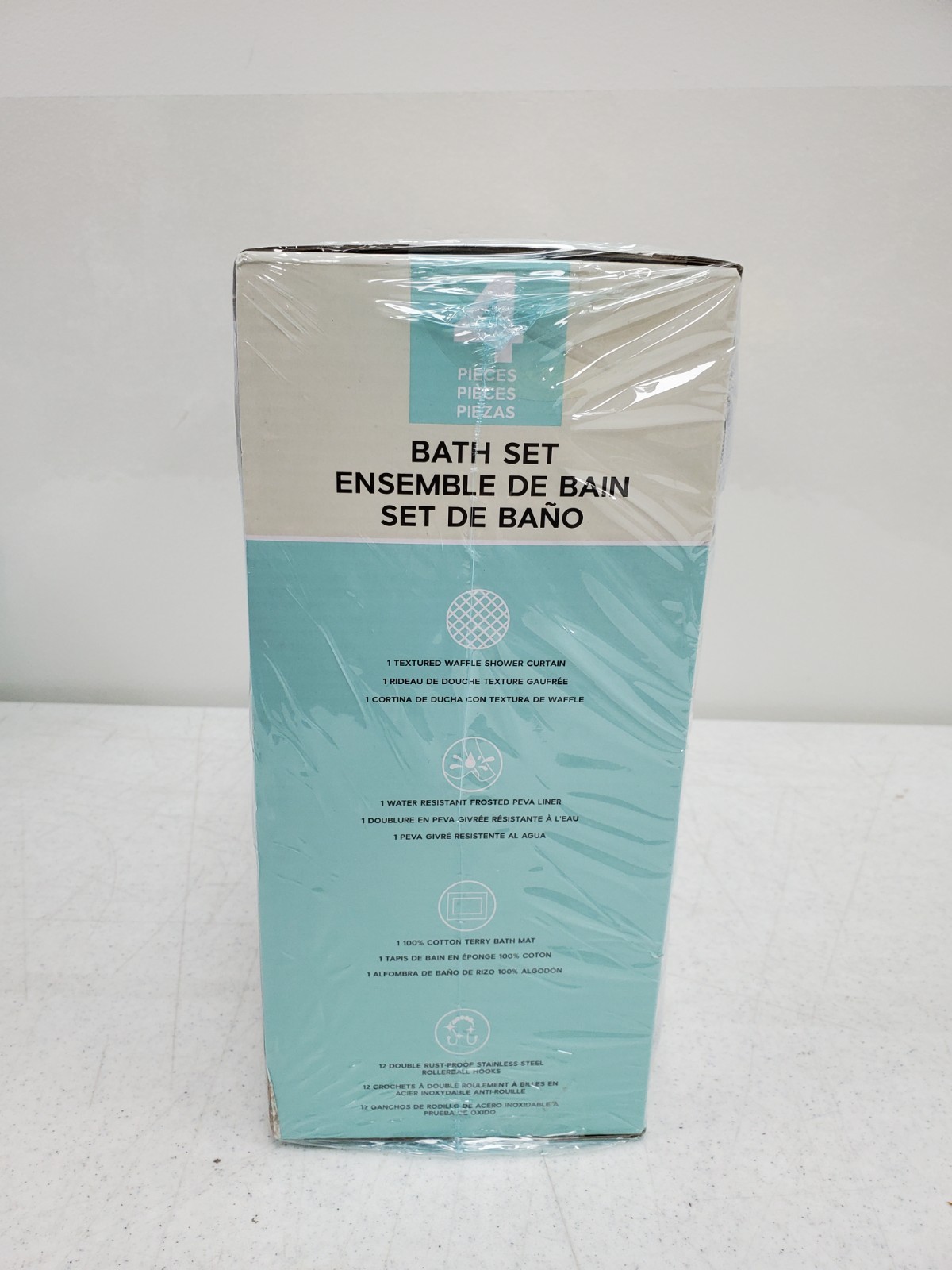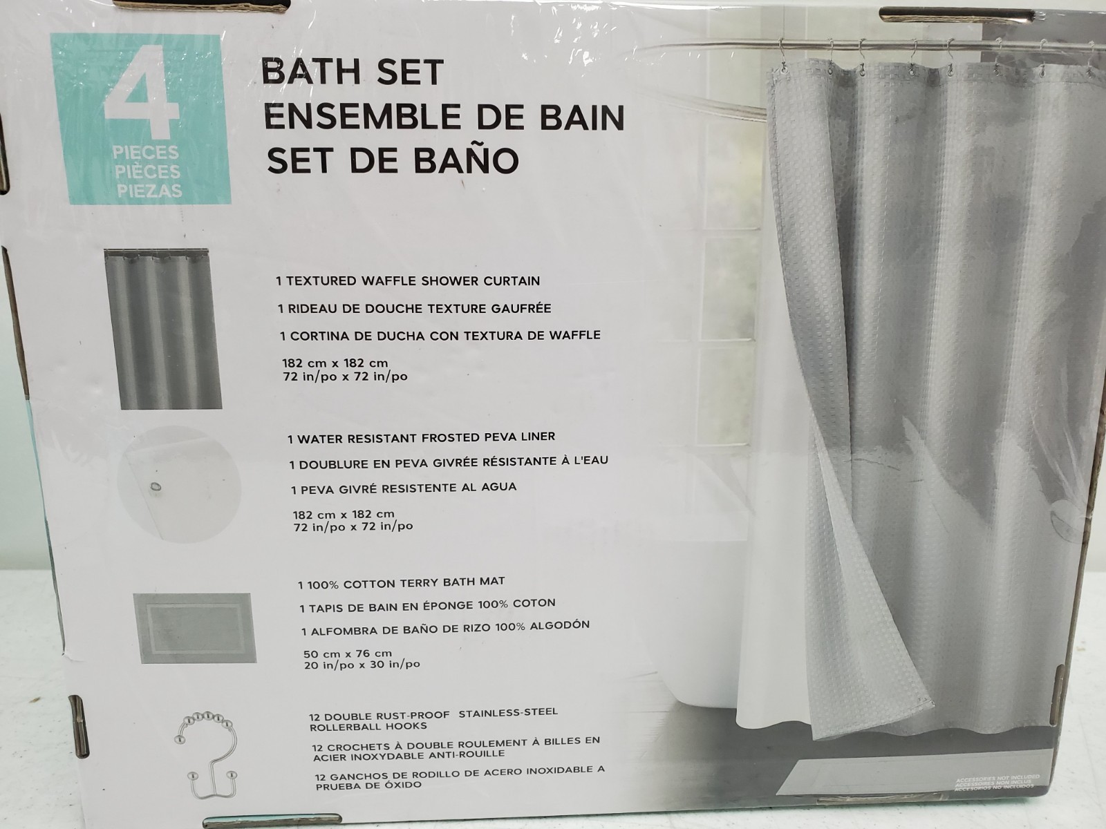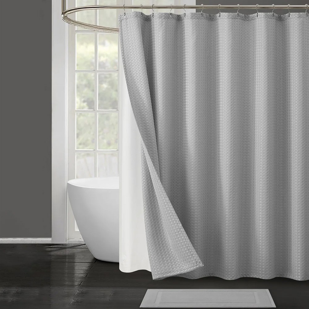 как выглядит ESSENTIAL SPA 4 Piece Bath Set Waffle Shower Curtain Liner 12 Metal Hooks Mat фото