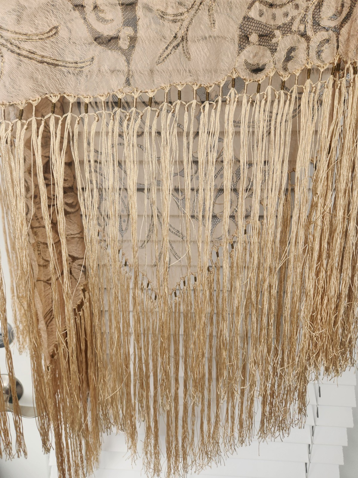 Vtg Floral Lace Piano Shawl Hand-Knotted Long Dramatic Fringe Metallic Thread
