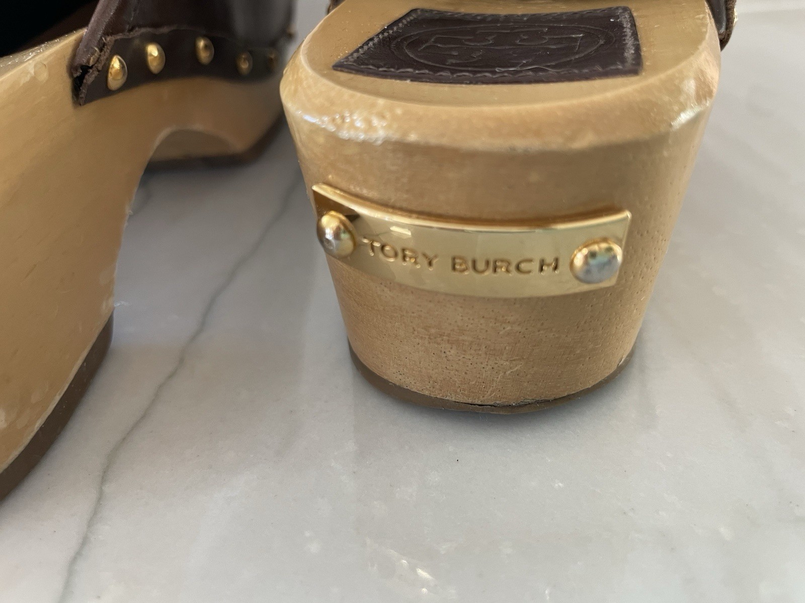 как выглядит Womens TORY BURCH Bryce Perforated Leather Clogs-Gold Tone Studs-Brown-Sz 7 фото