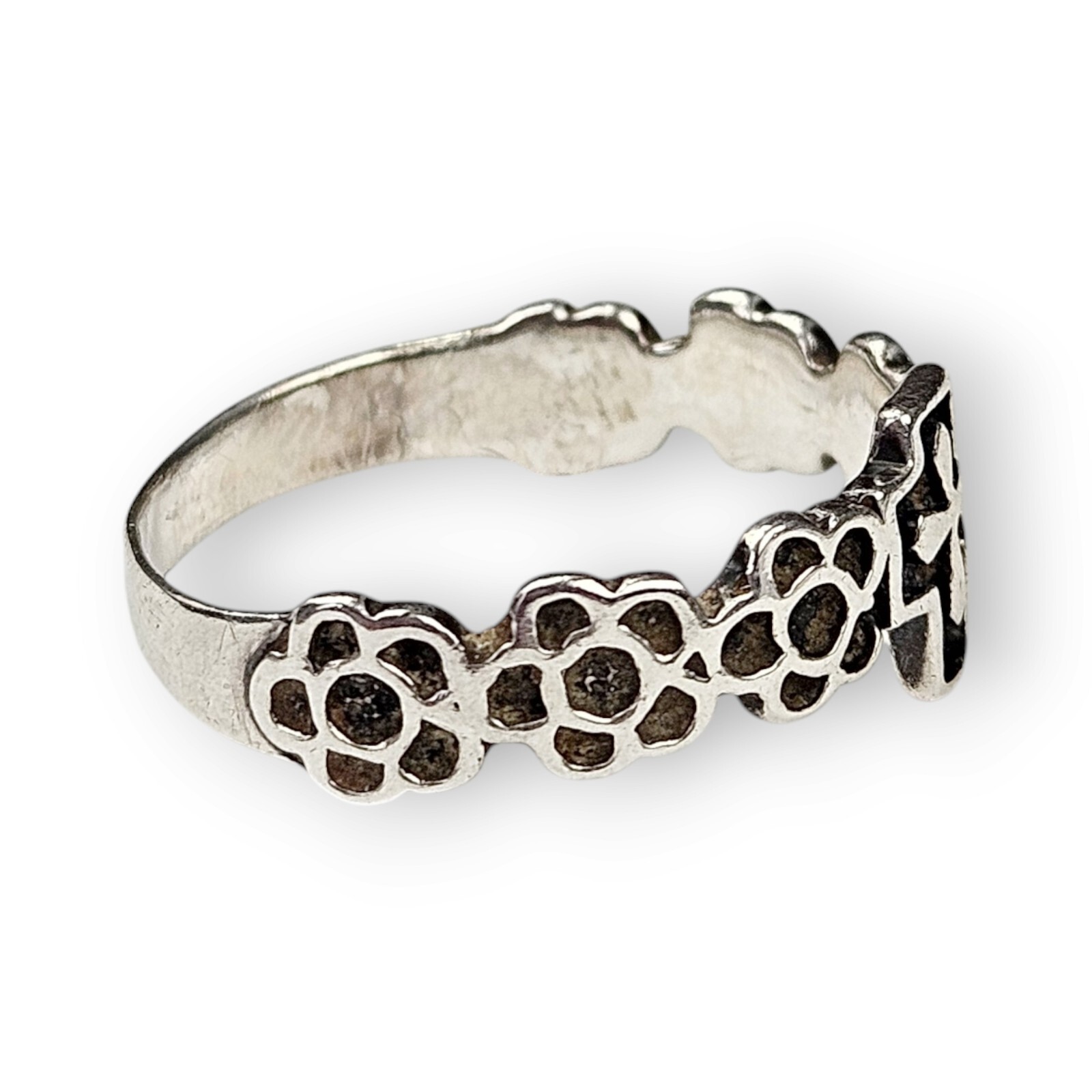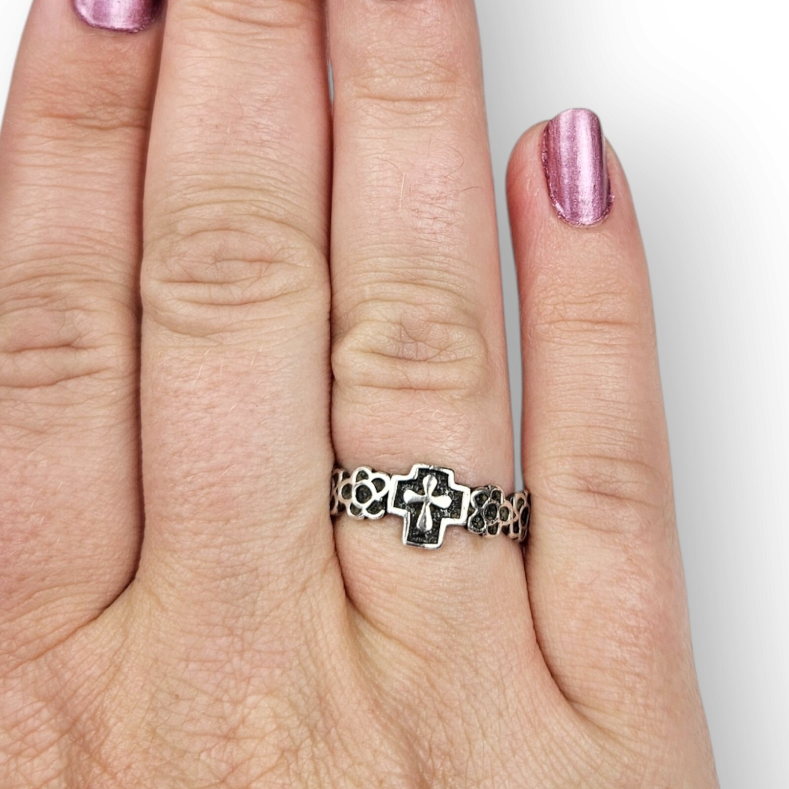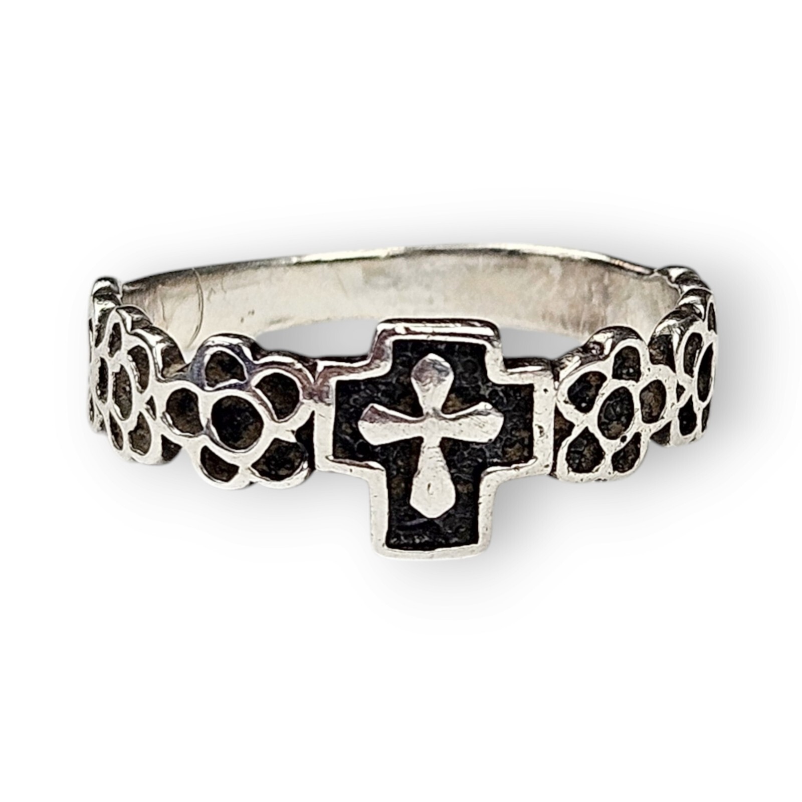 Sterling Cross Flower Band Ring Oxidized 925 Silver Religious Vintage Size 9.5