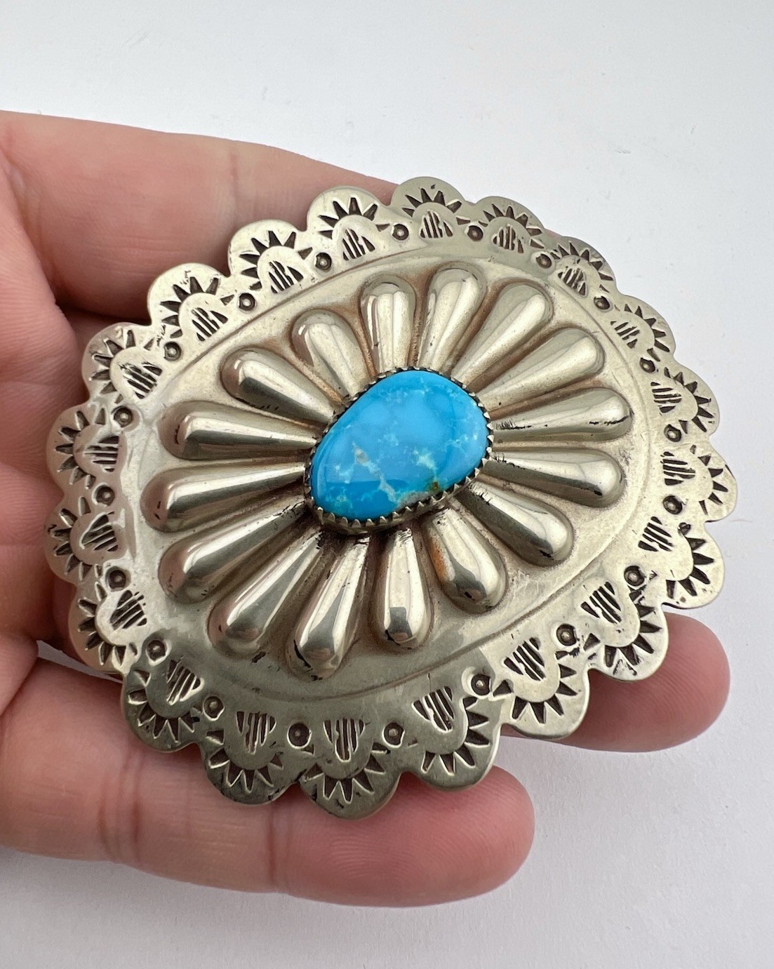 • Vtg Navajo Nickel Silver High Grade Fox Turquoise Stamped Concho Belt Buckle 3"