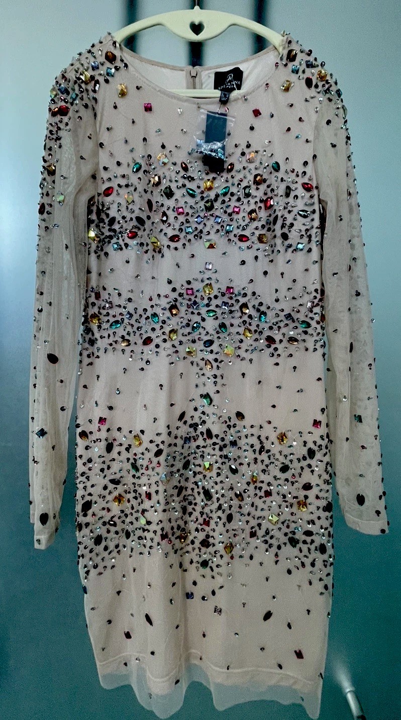 NWT Adriana Papell Jeweled Rhinestone Dress - Multicolor Gems Nude Mesh Size 10
