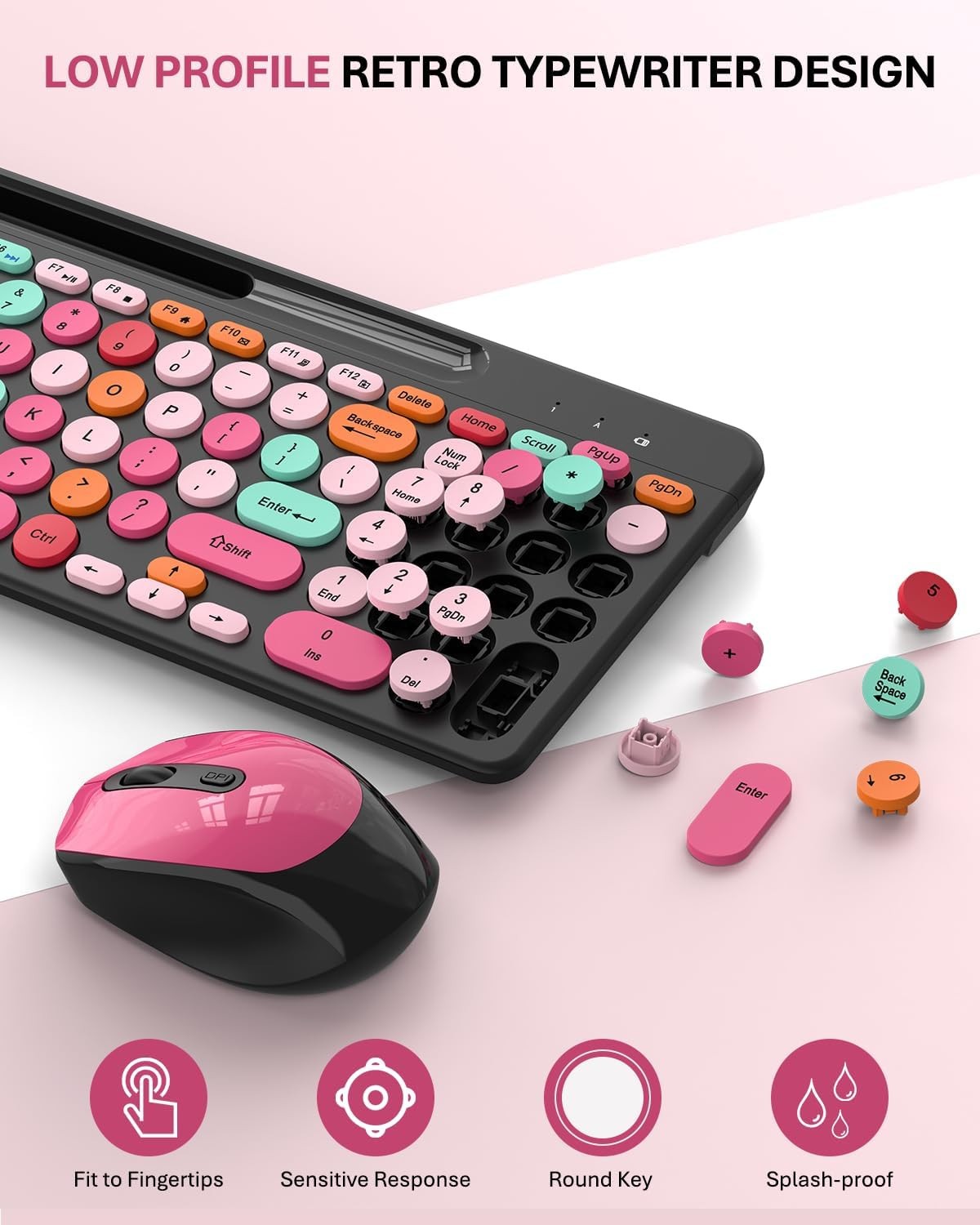 Pink Black Colorful Wireless Keyboard and Mouse Combo - Round Keycaps, 2.4GHz
