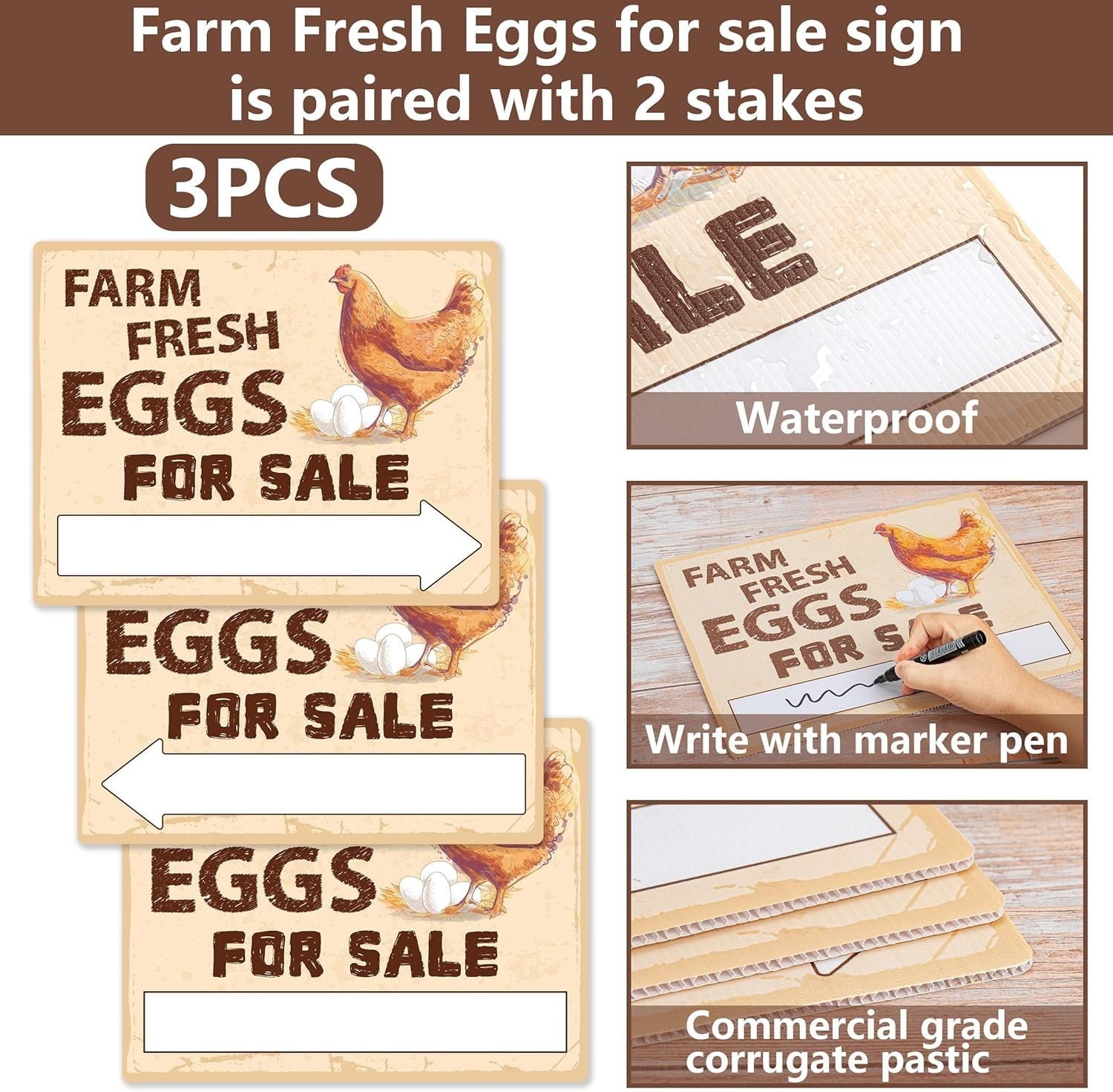 3Pcs Double Sided Farm Fresh Eggs Sign for Sale Sign Corrugated Plastic 6 Stakes