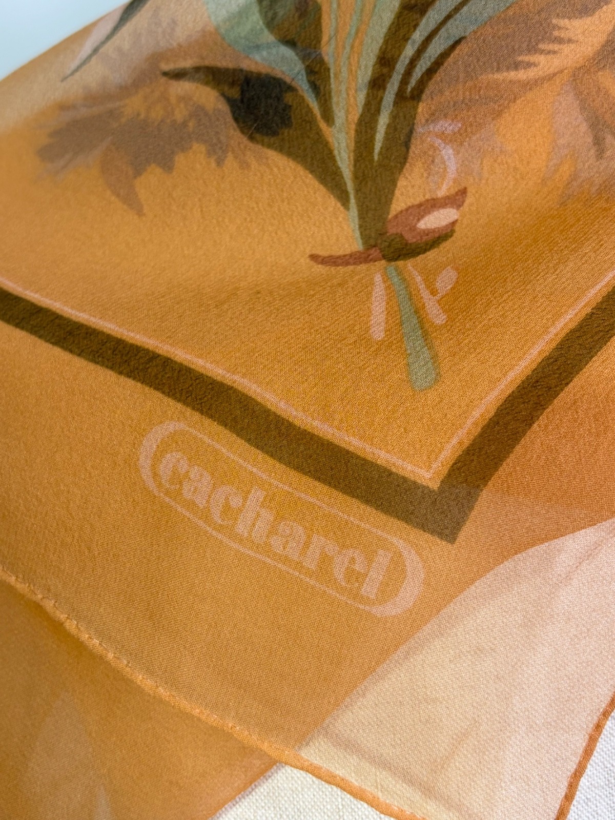 как выглядит Casharel- Vintage Sheer Dark Orange w/ Bearded Iris Square Scarf- Signed фото