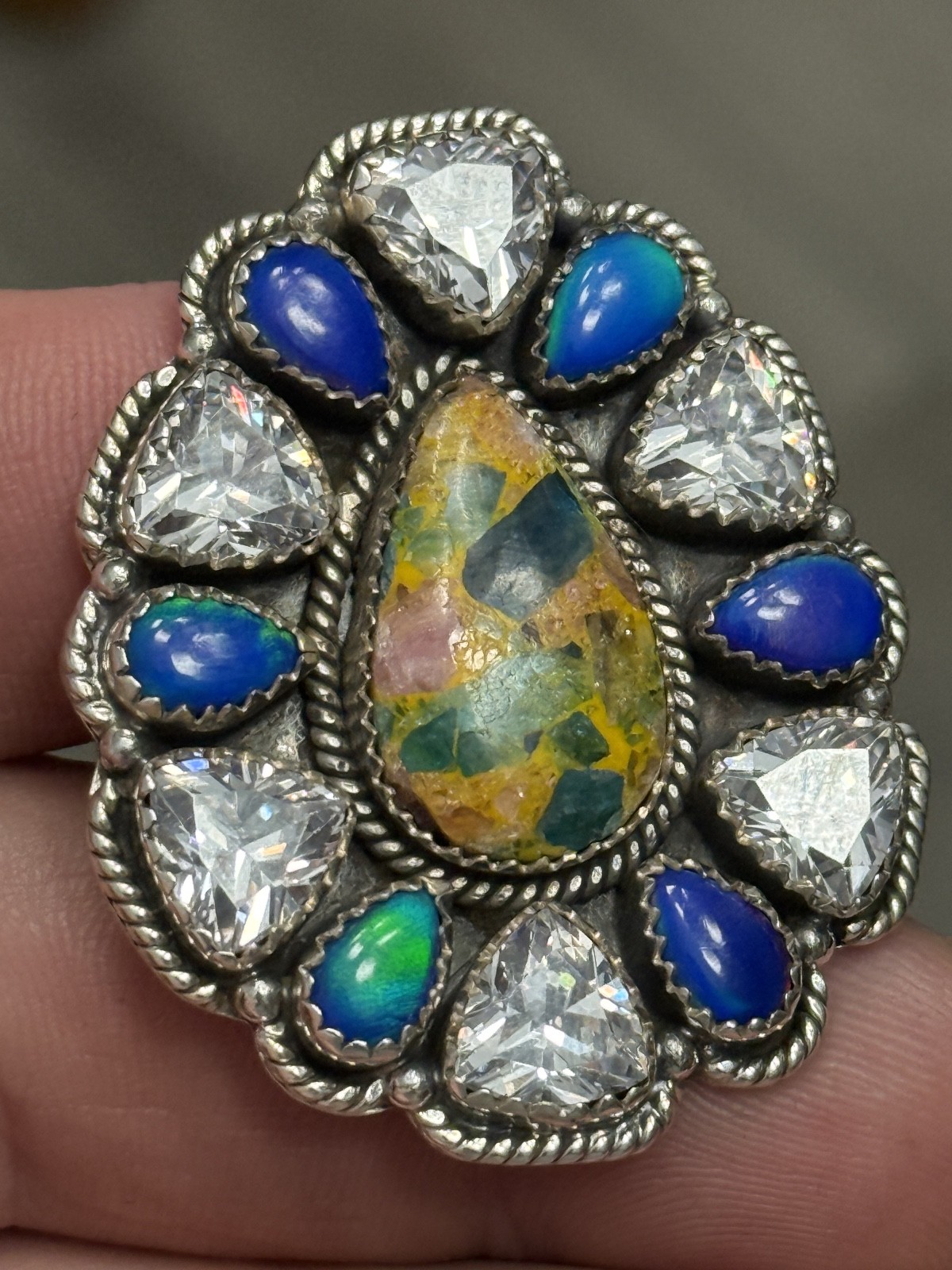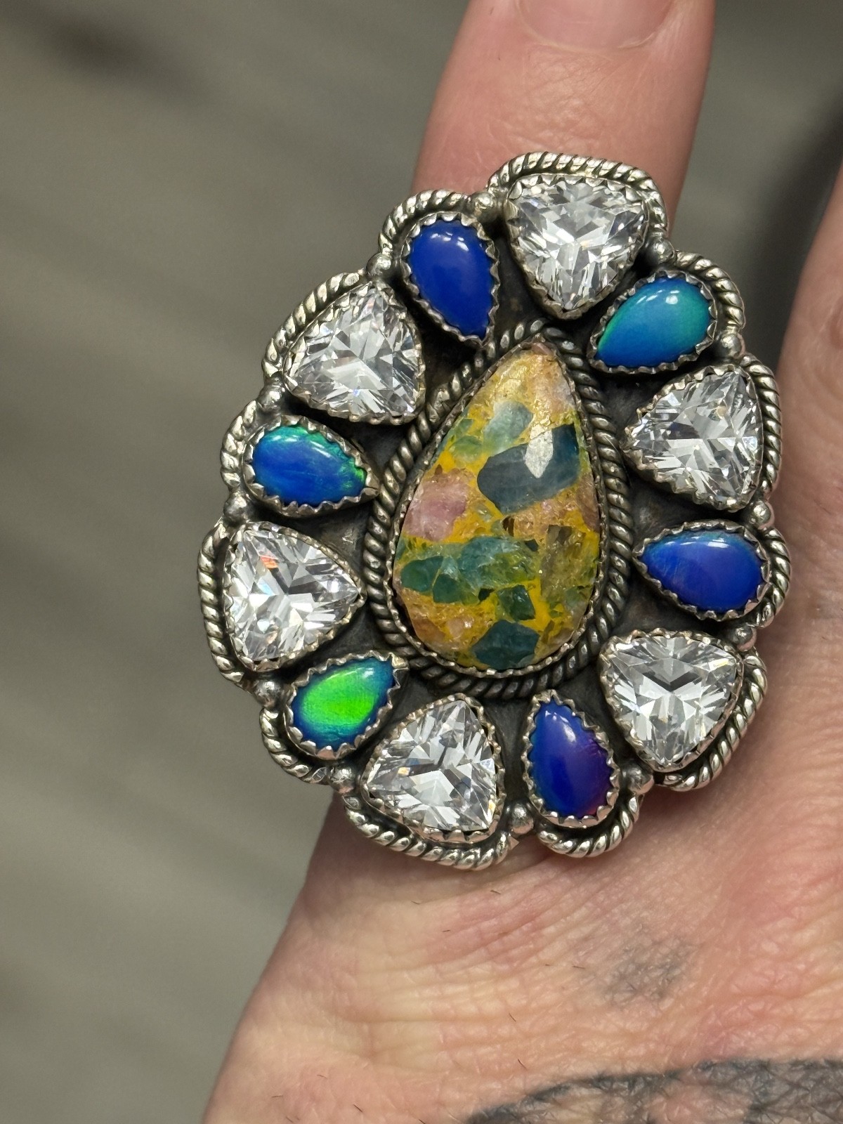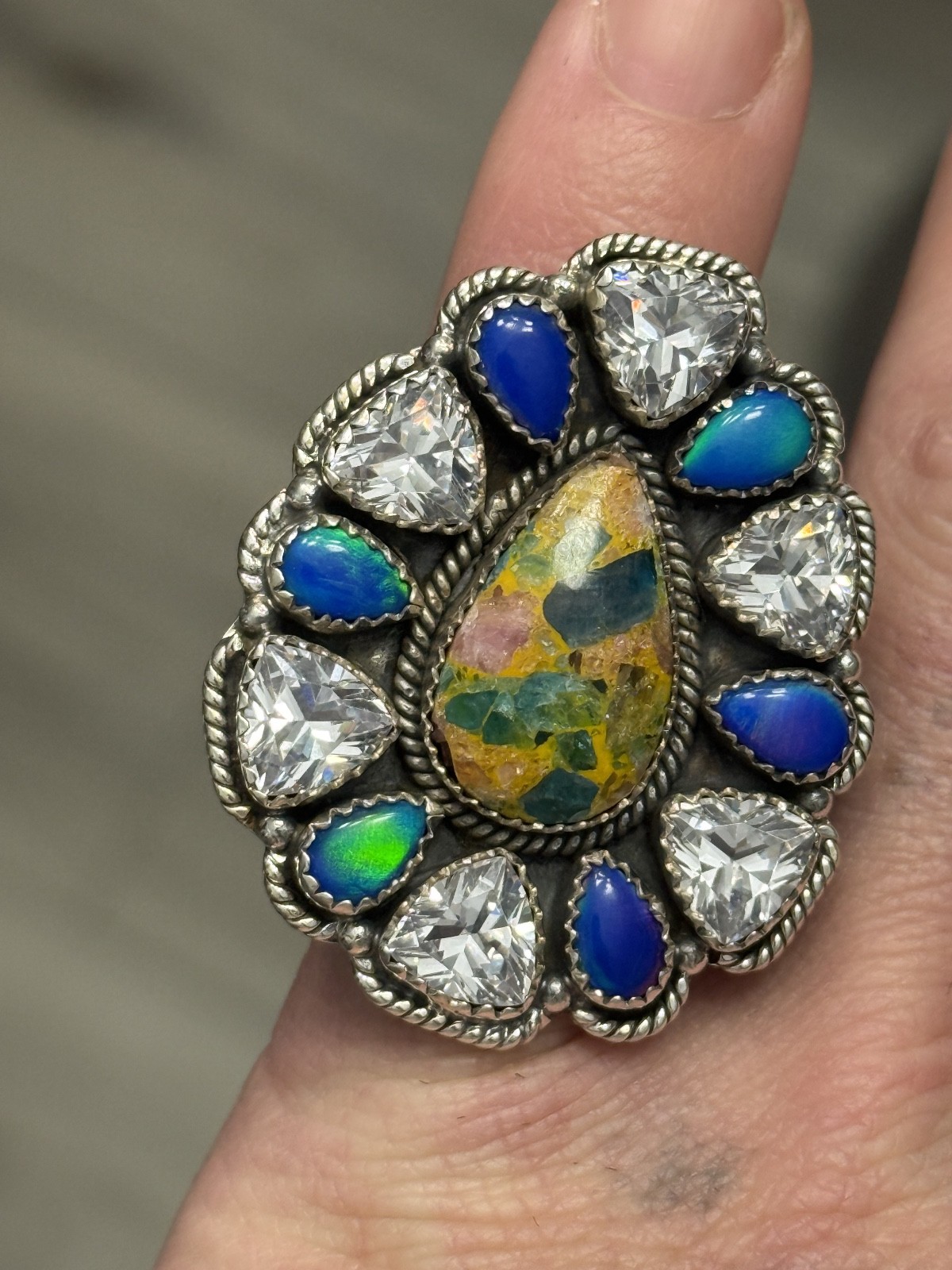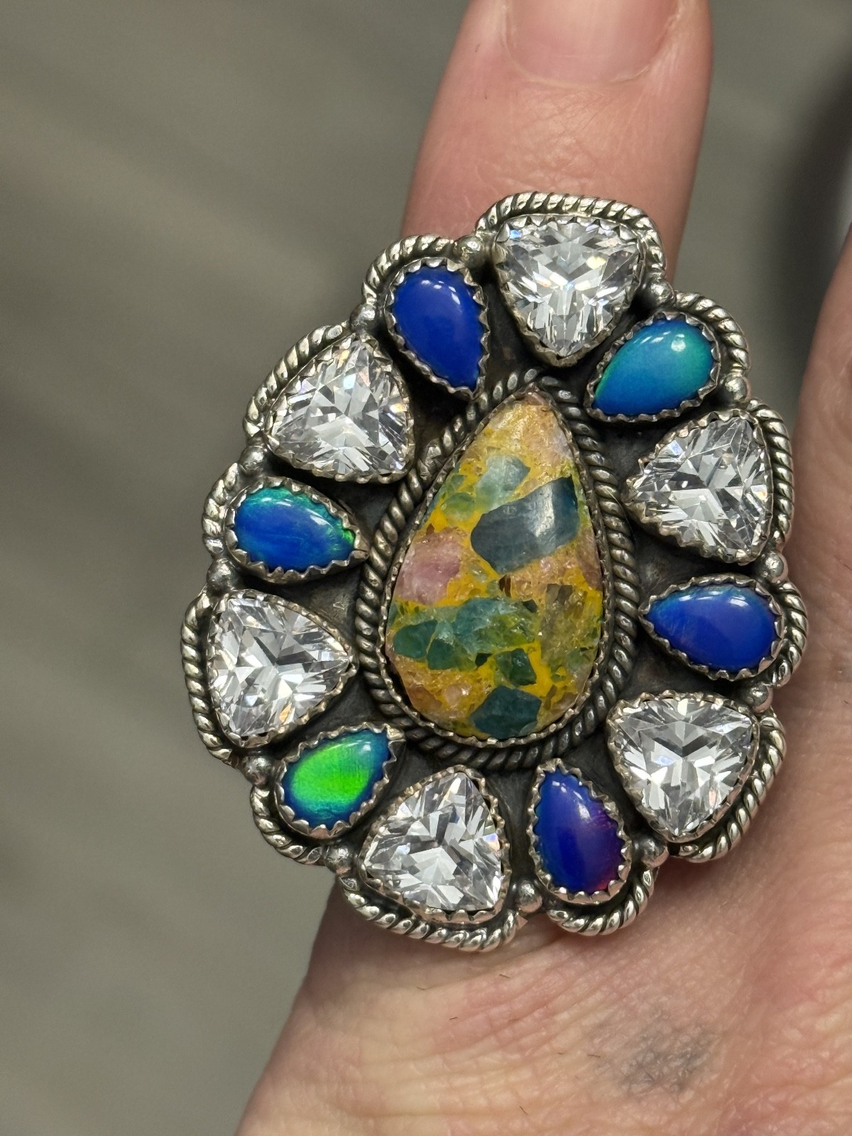 STERLING SILVER HUGE BLUE AURORA OPAL CZ ADJUSTABLE STATMENT CLUSTER RING .925