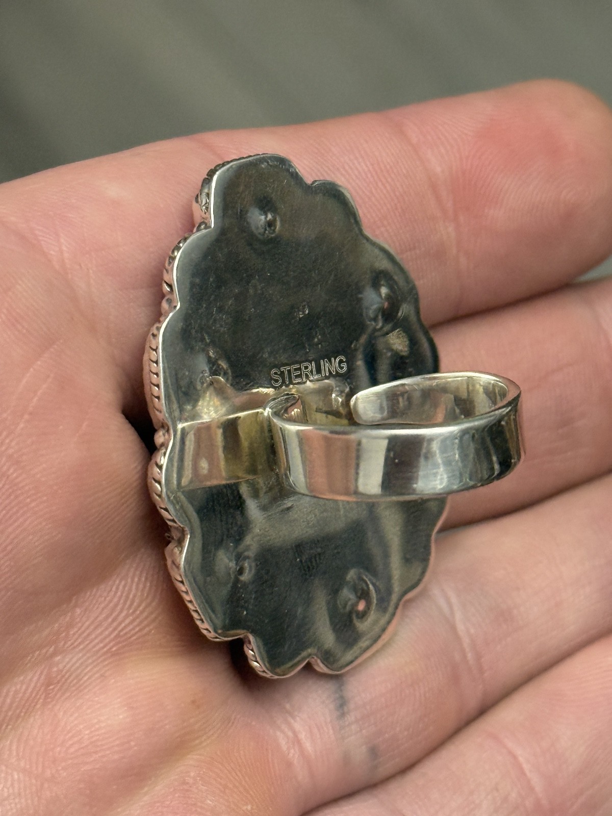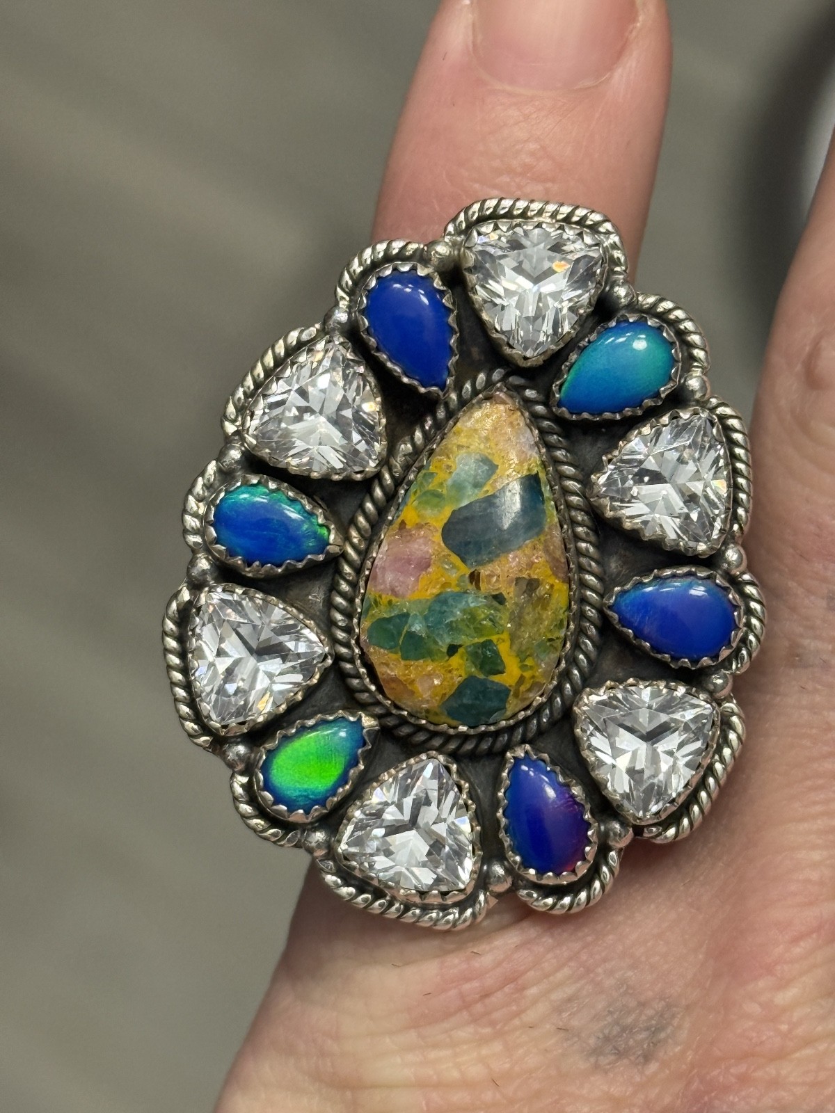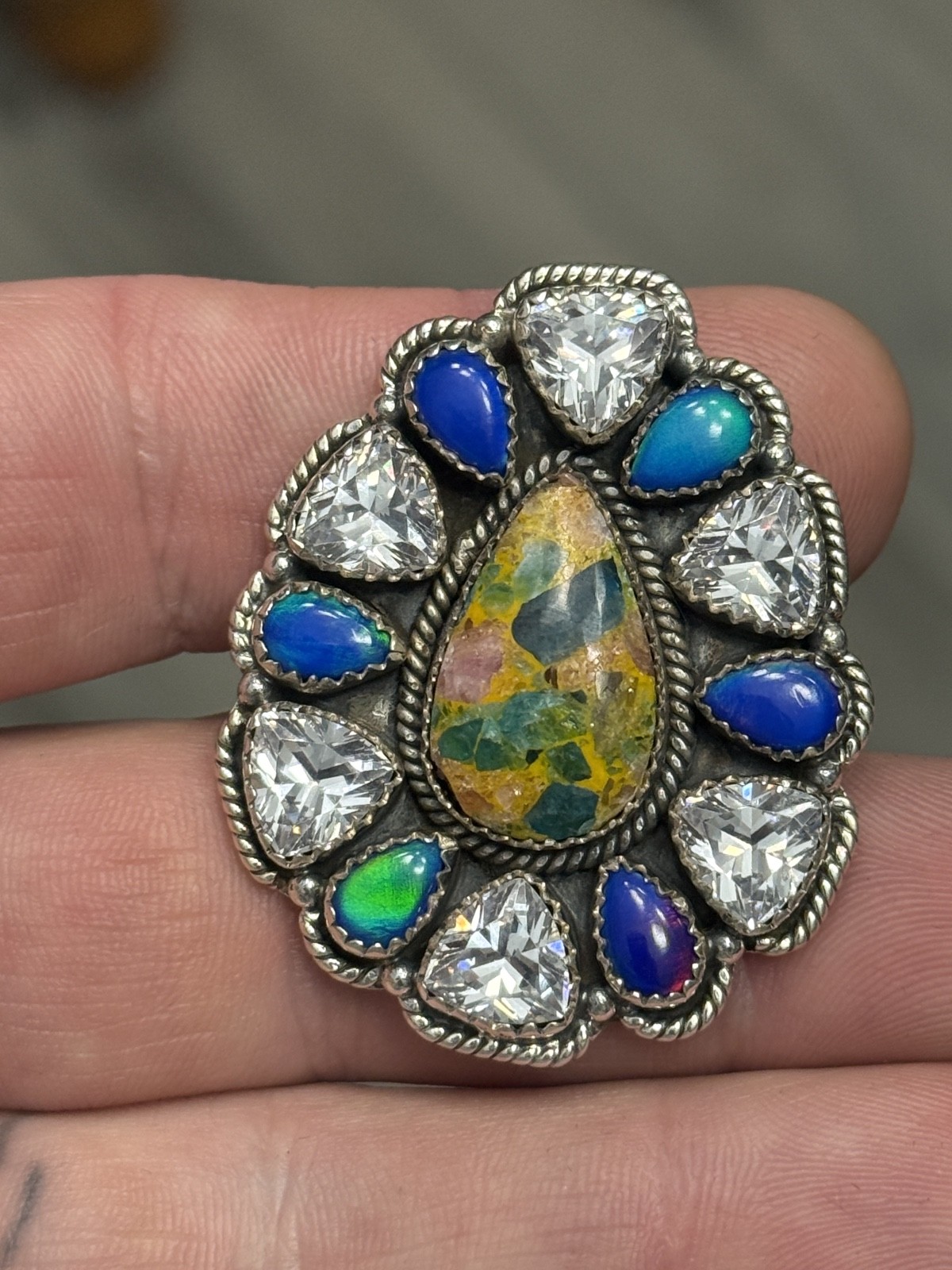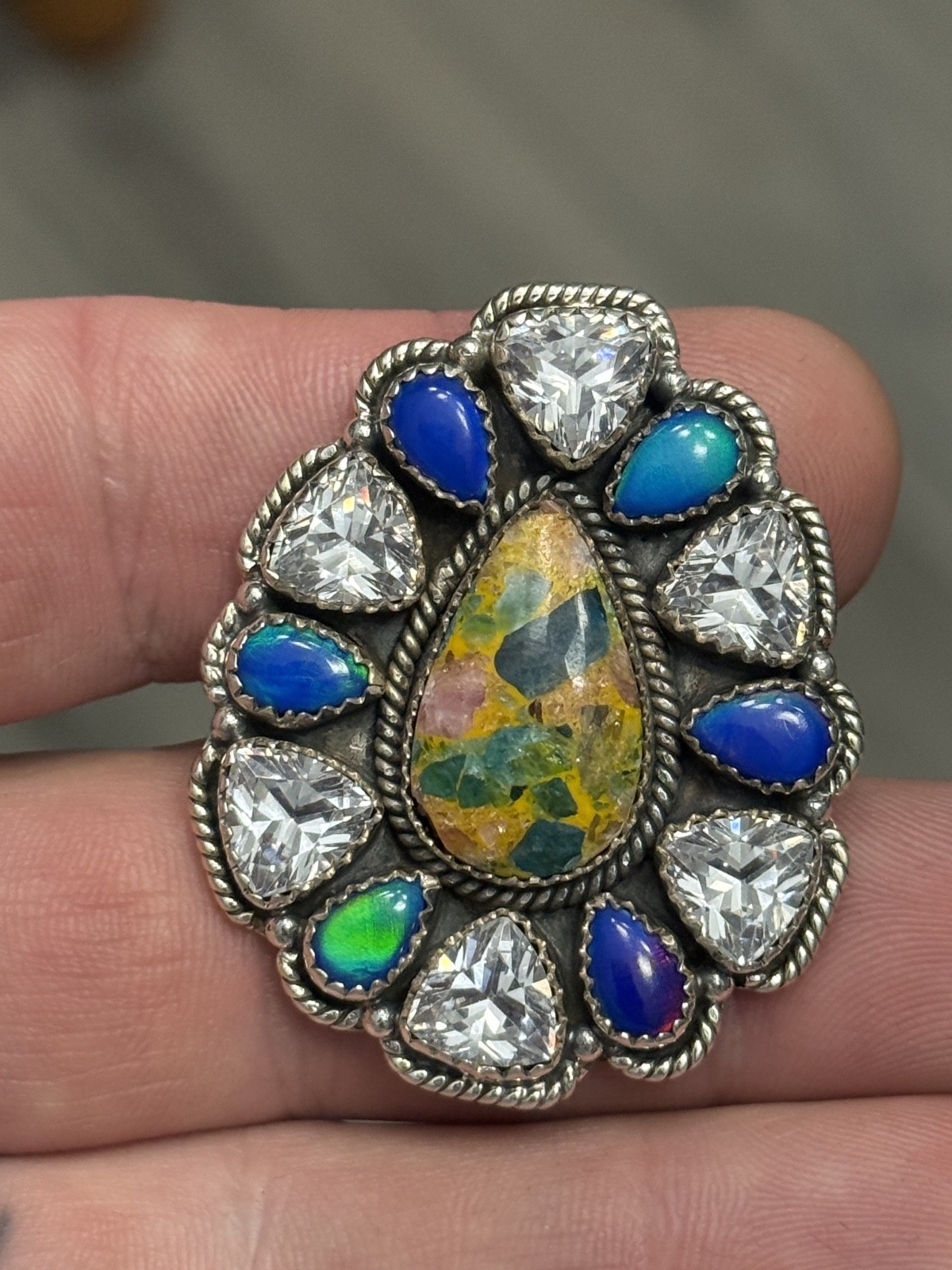 STERLING SILVER HUGE BLUE AURORA OPAL CZ ADJUSTABLE STATMENT CLUSTER RING .925