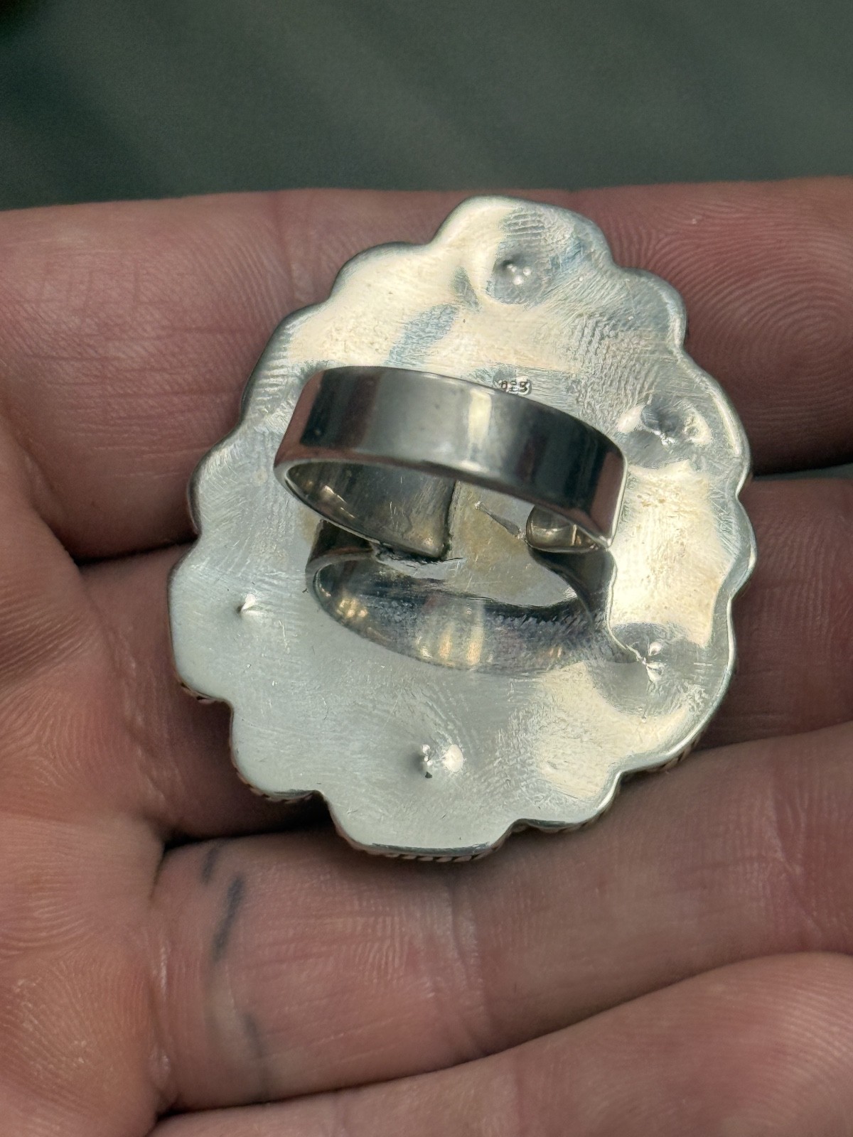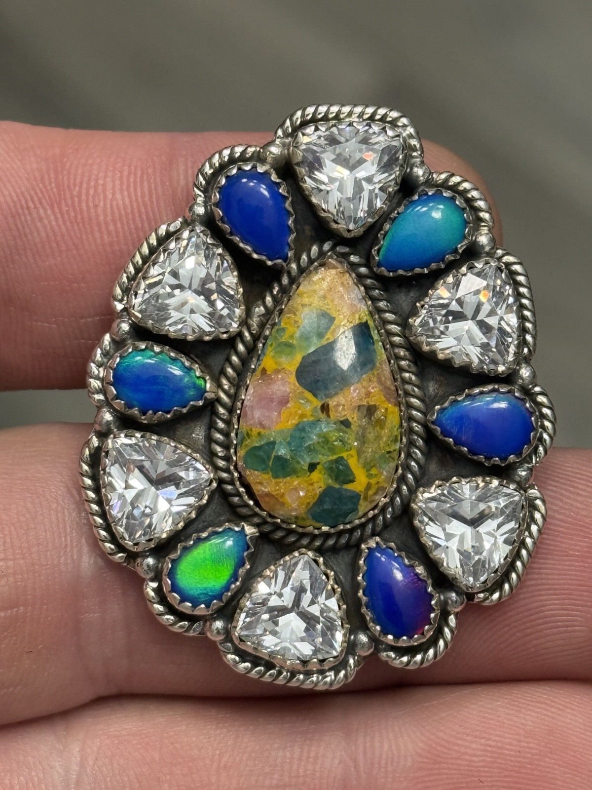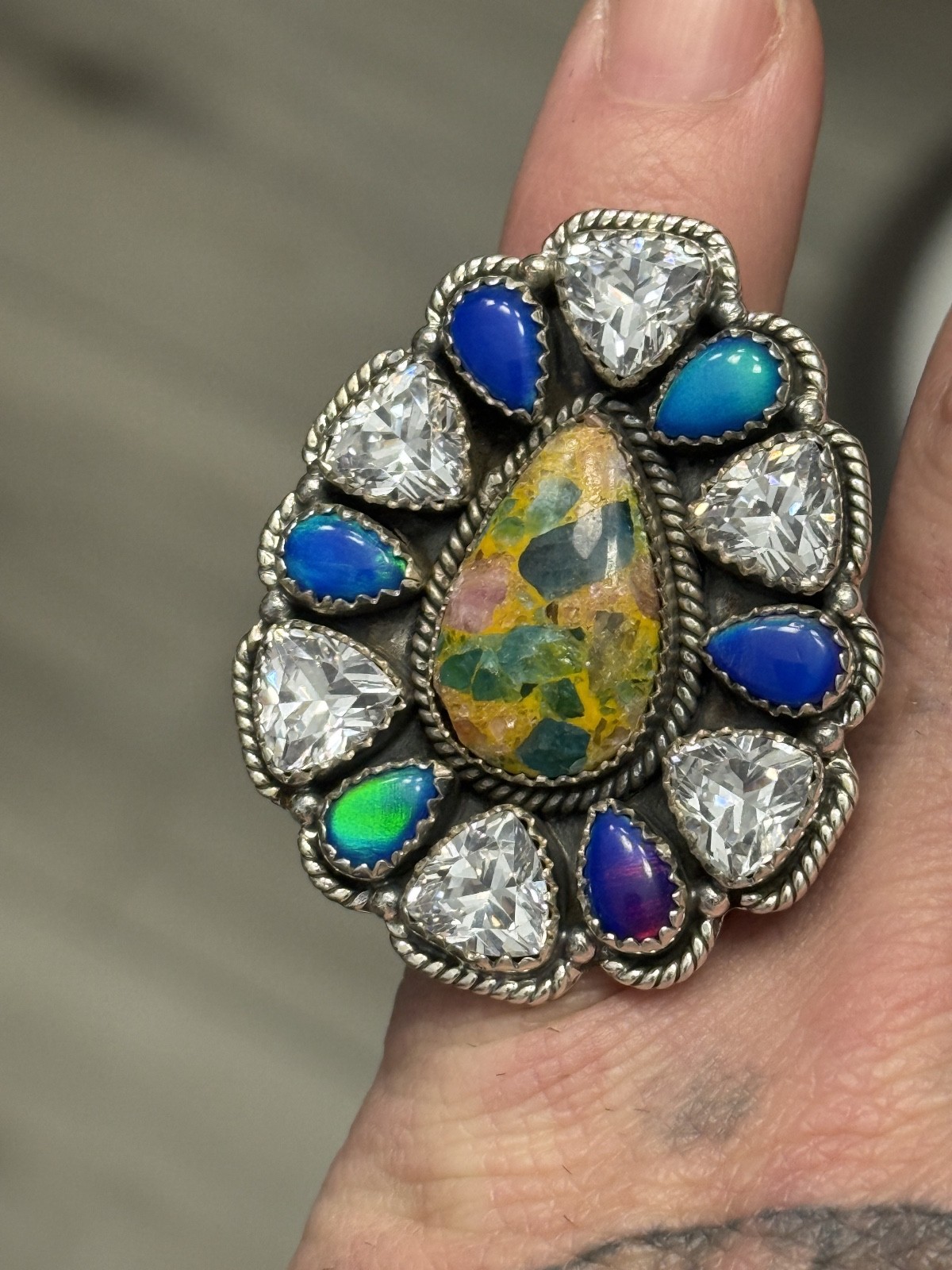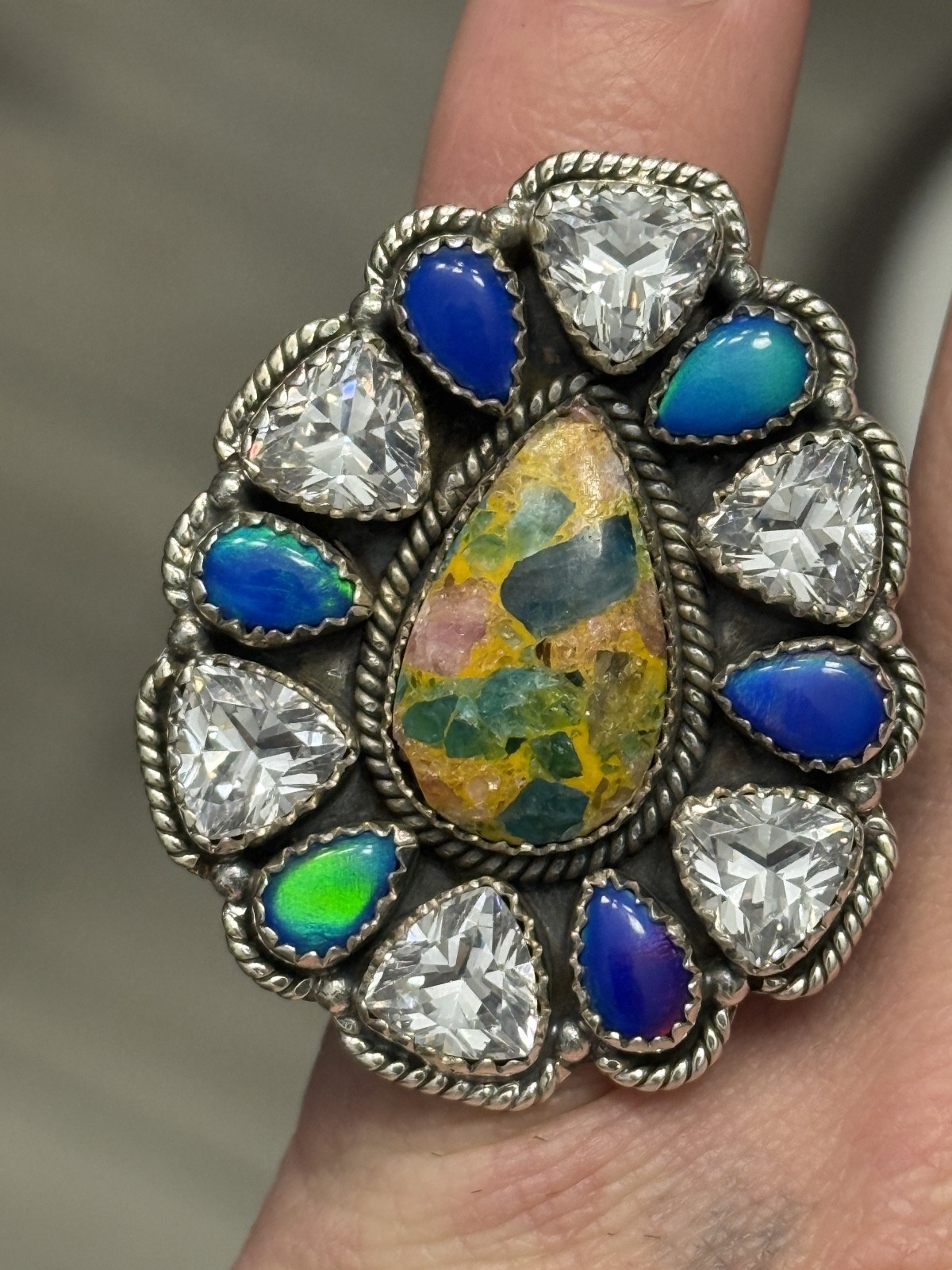 как выглядит STERLING SILVER HUGE BLUE AURORA OPAL CZ ADJUSTABLE STATMENT CLUSTER RING .925 фото