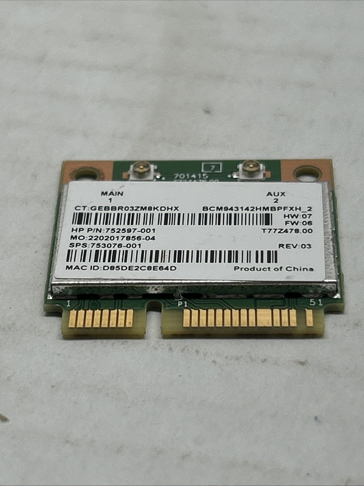 HP 752597-001 802.11n Mini PCI-Express Wireless Wi-Fi And BlueTooth Card