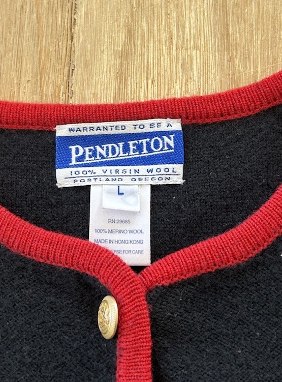 как выглядит Pendleton Vintage merino wool Black Red Faux Tassels Gold Tone Button Cardigan L фото