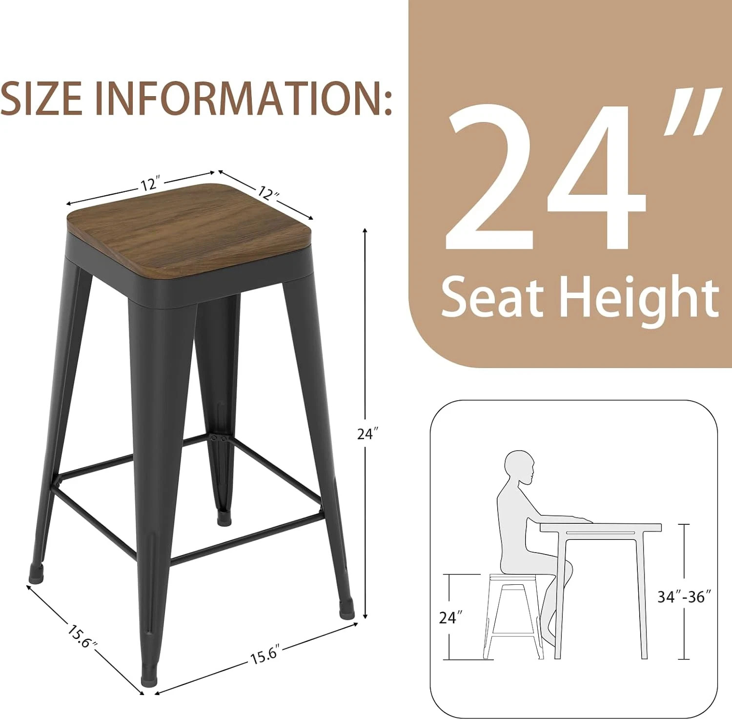 Set of 4 Industrial 24 Backless Metal Bar Stools with Wood Seat - Black
