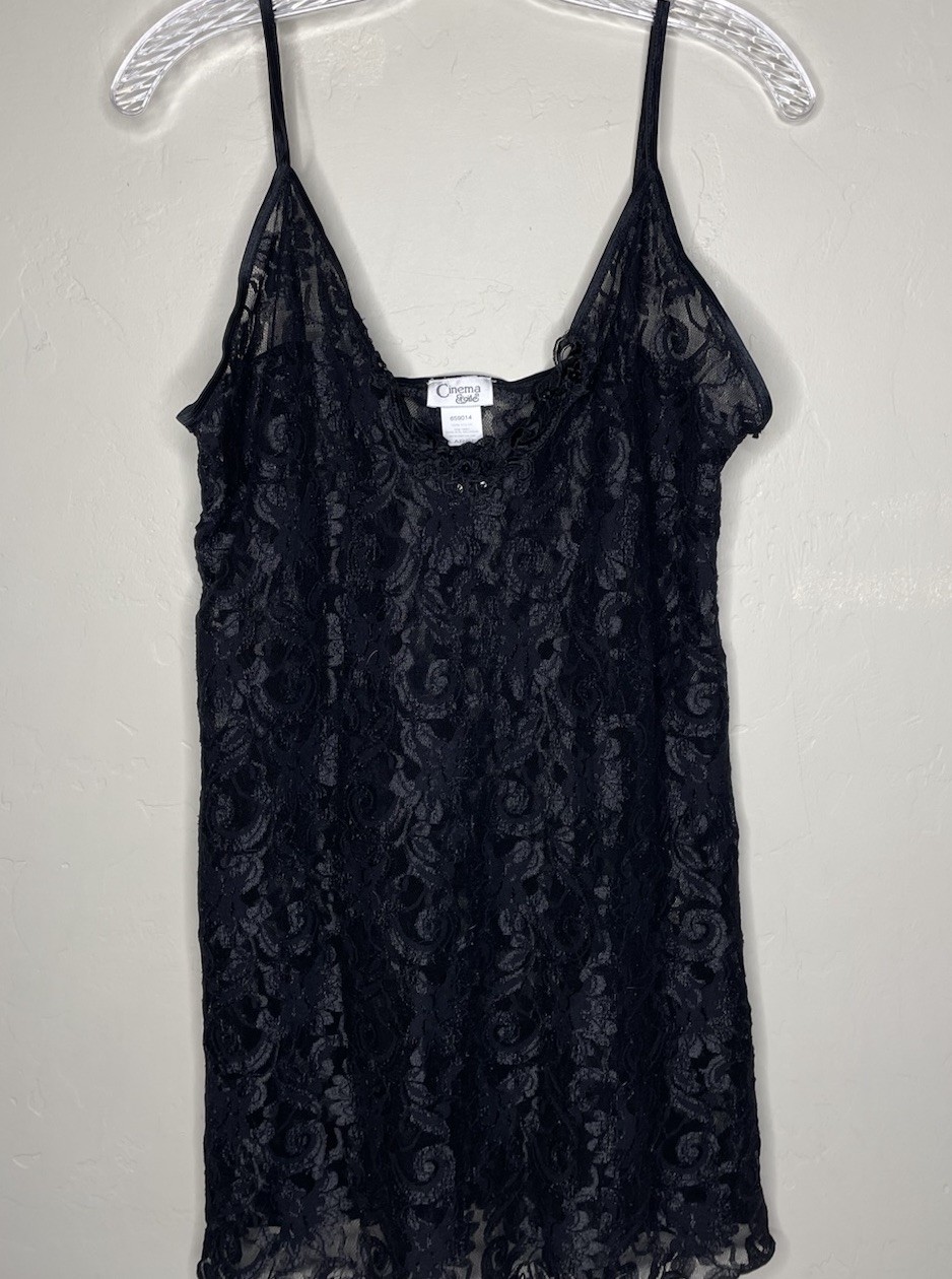 Vtg Cinema Etoile Large Nightgown Lingerie Slip Dress Satin Lace Midi Black