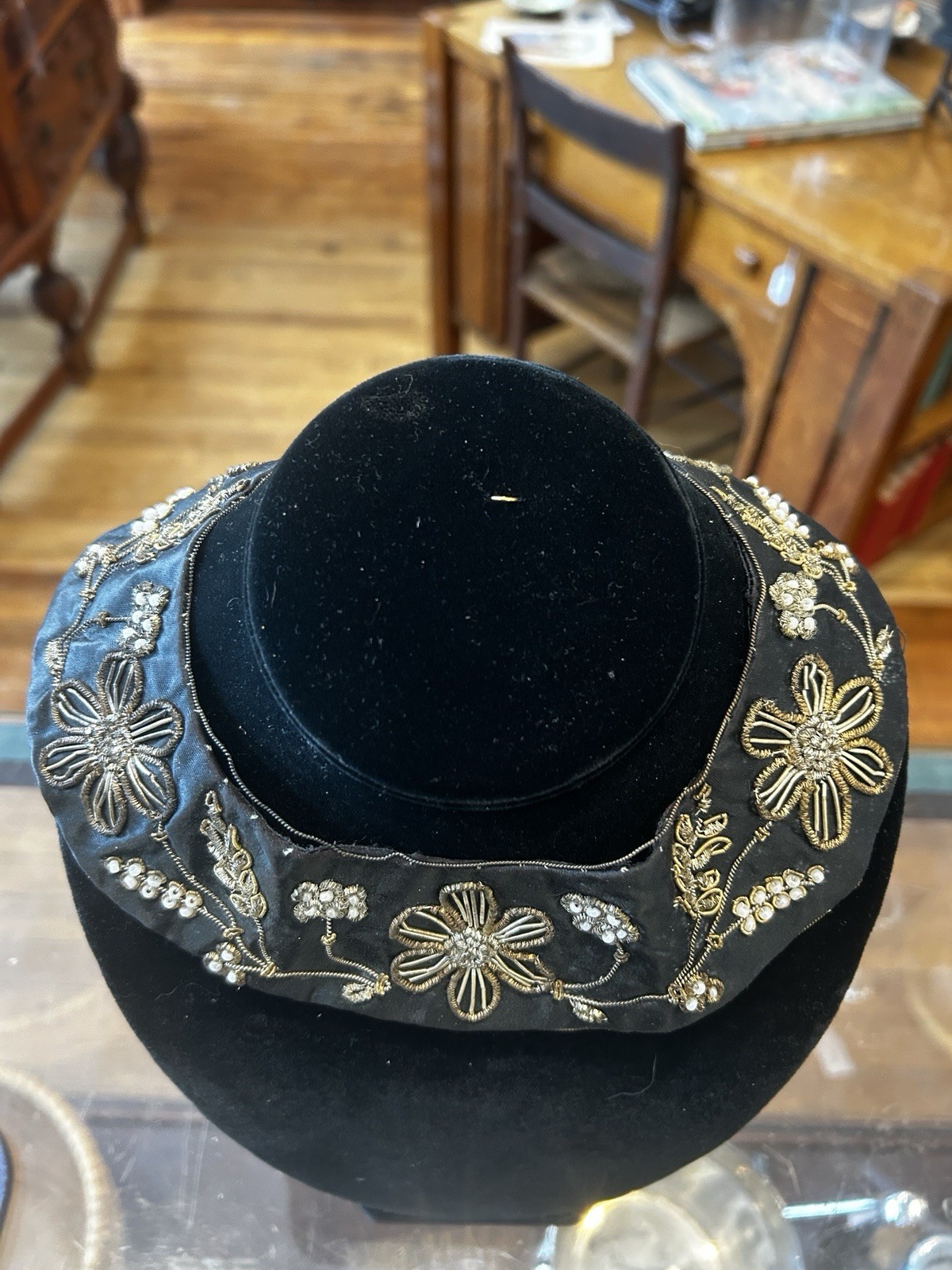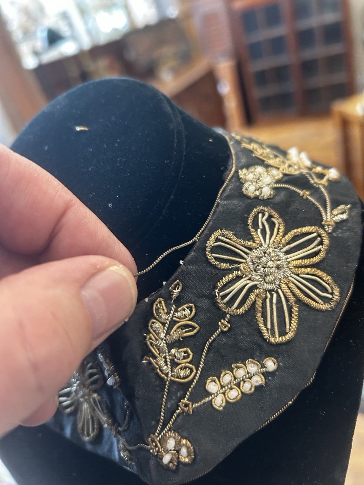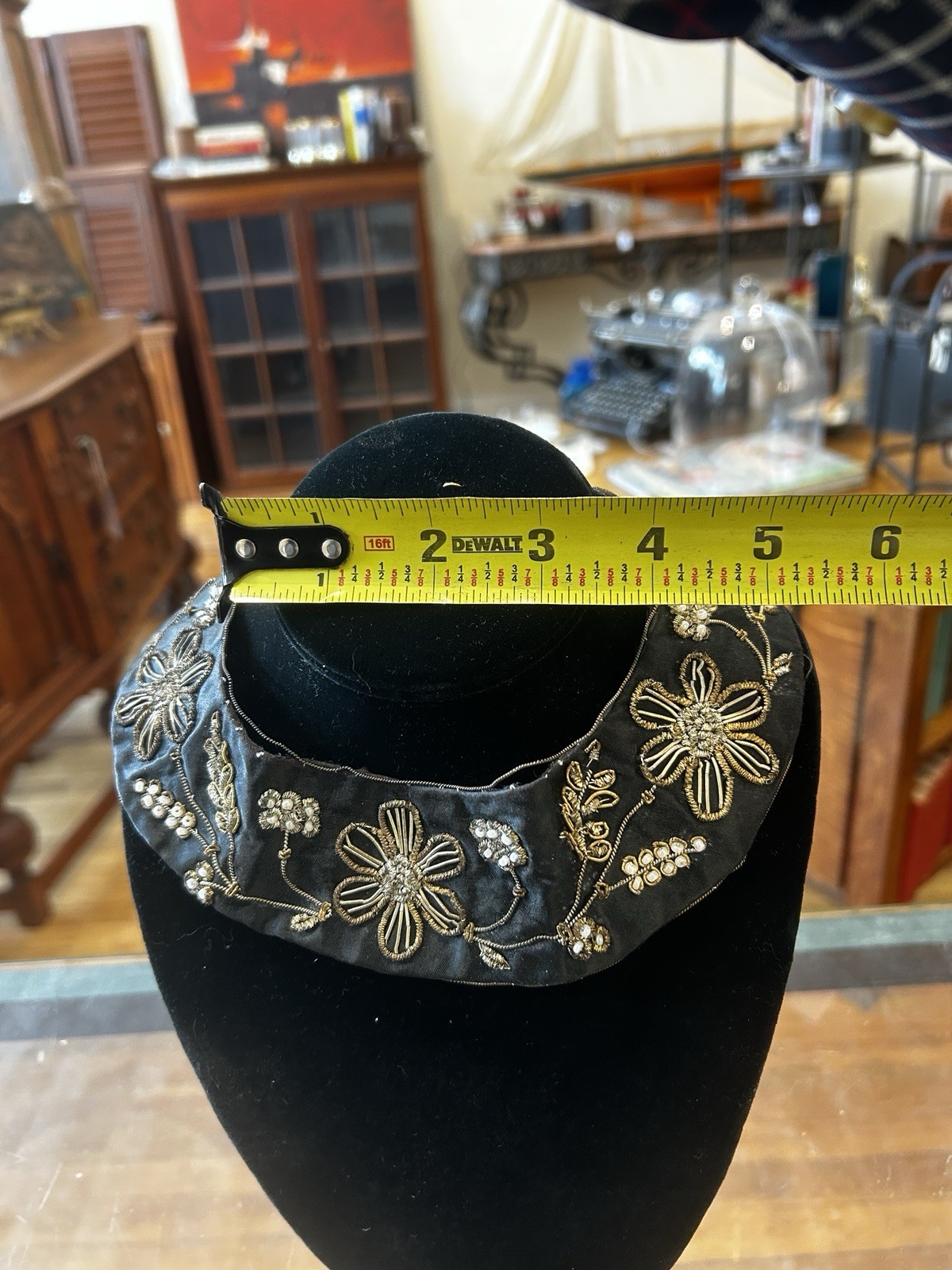 как выглядит Vintage Handmade Mid Century Black Silk Beaded Gold Wire Add On Collar India фото