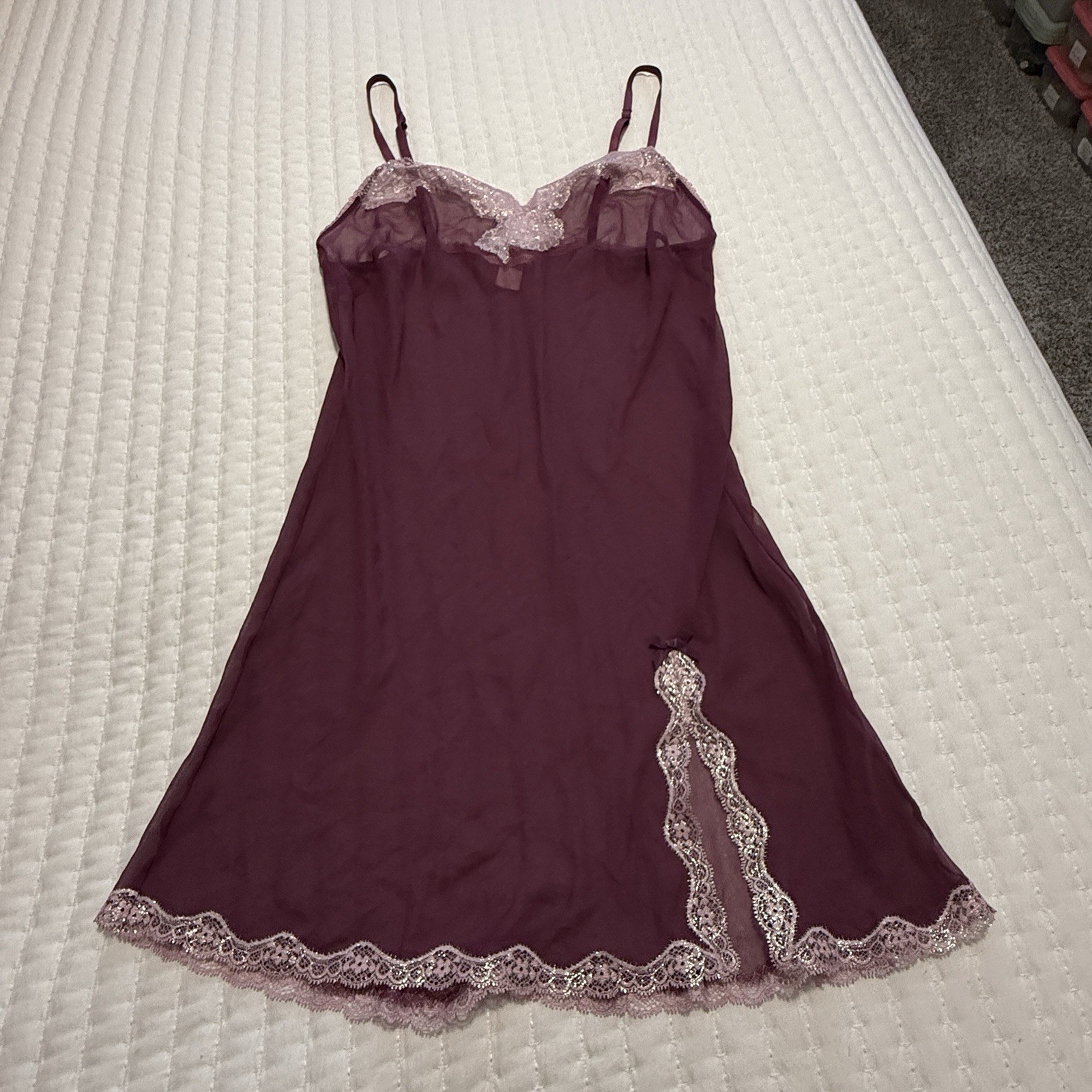 Victoria s Secret Sheer Purple Chemise Slip Dress Sz S Small Pink Lace Trim
