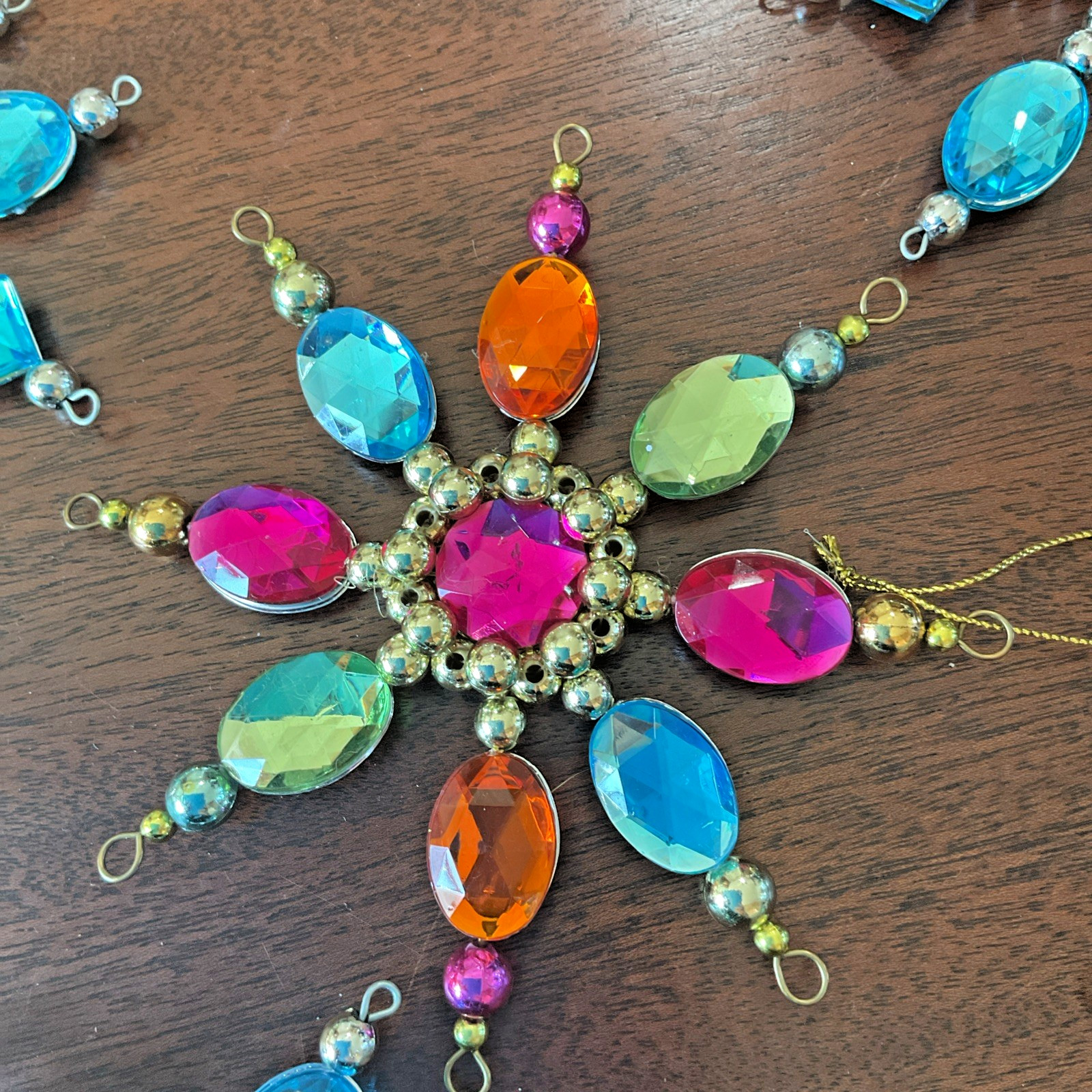 • Vtg Beaded Snowflake Ornaments Large Gems Hanging Set 5 Blue Silver Multi 5