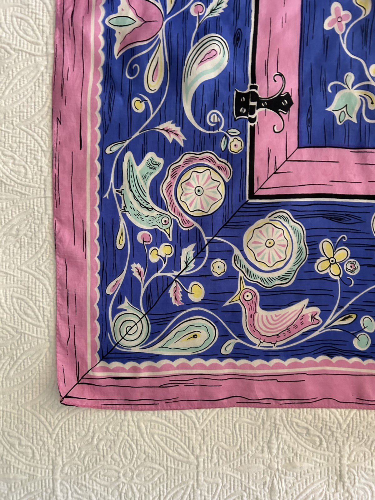 Vintage 1980s Rayon Bright Blue Pink Scarf 33 Square Birds Famer Barn Door