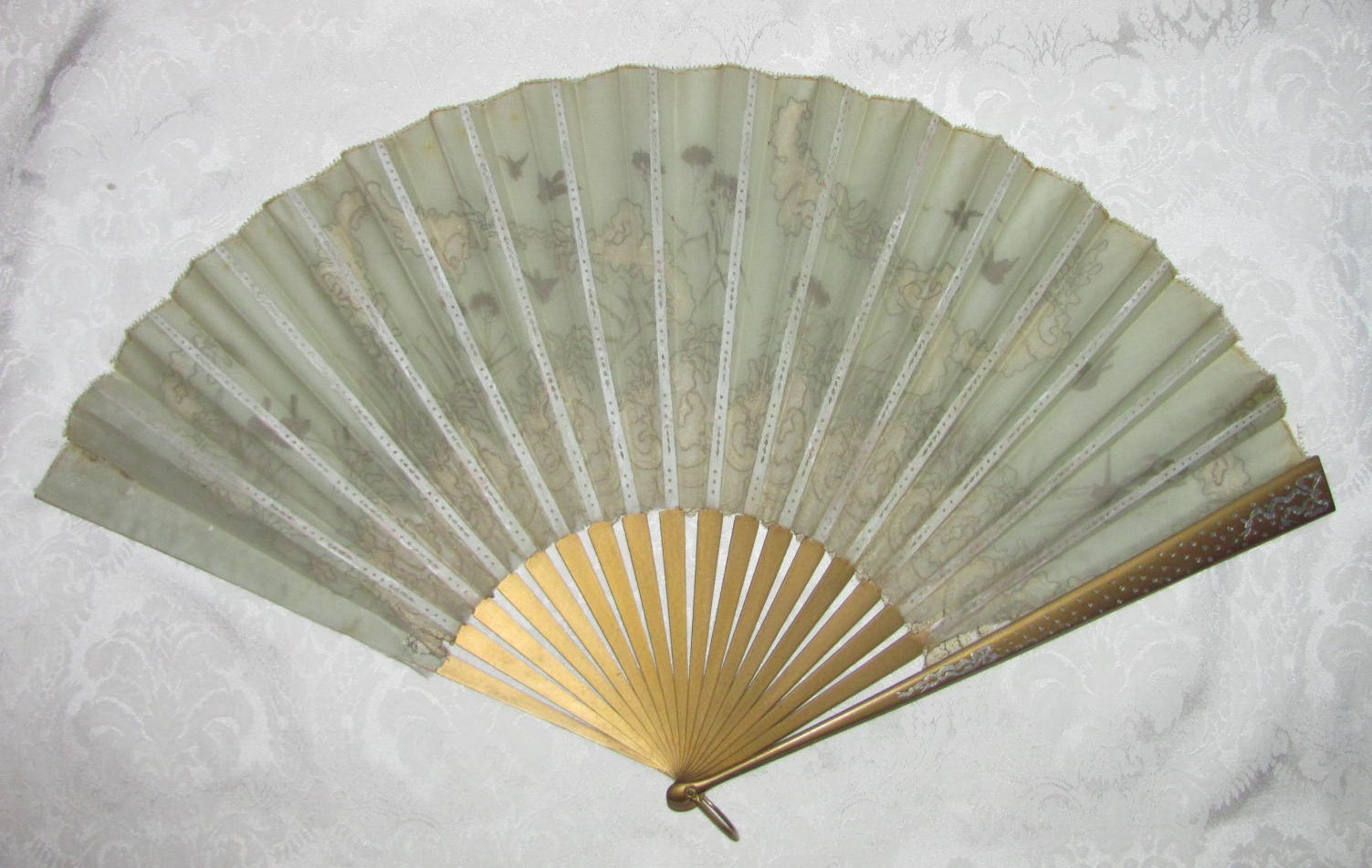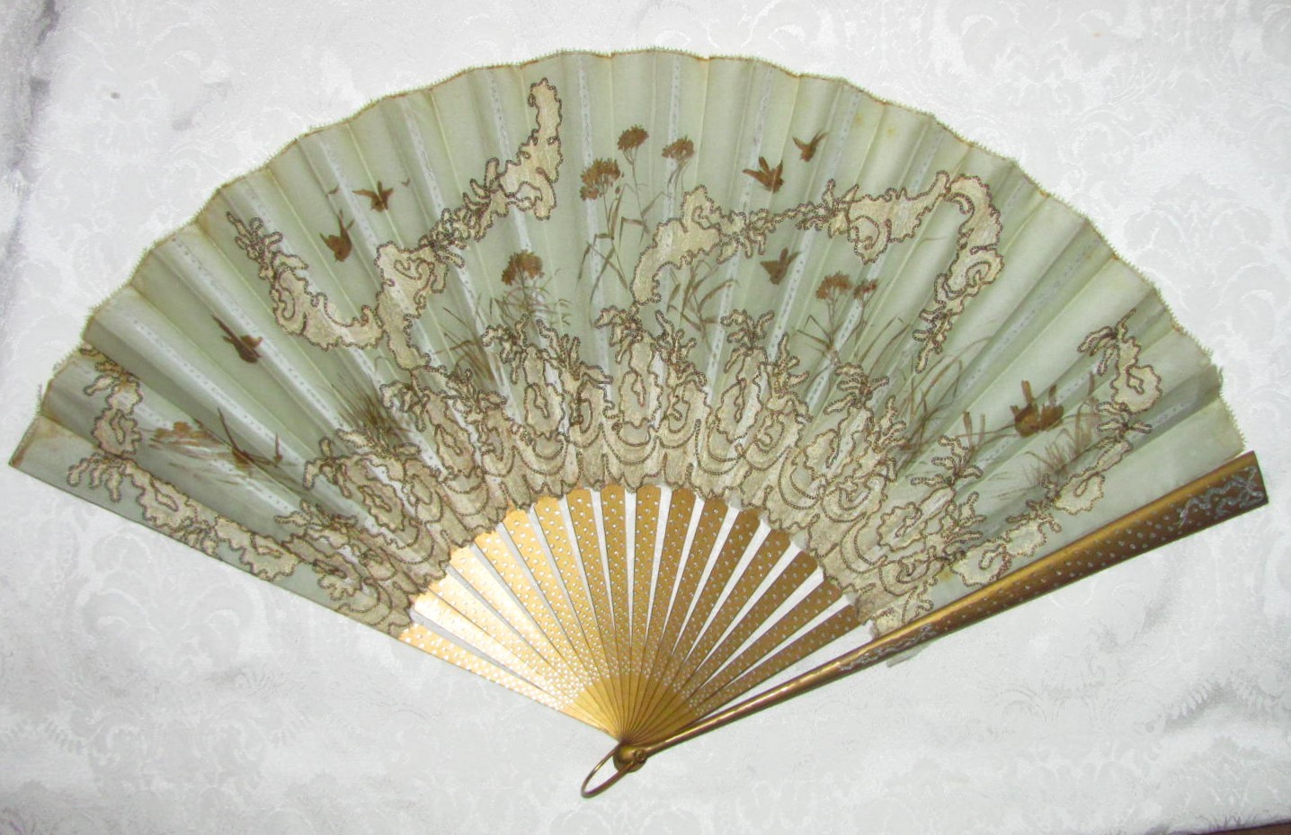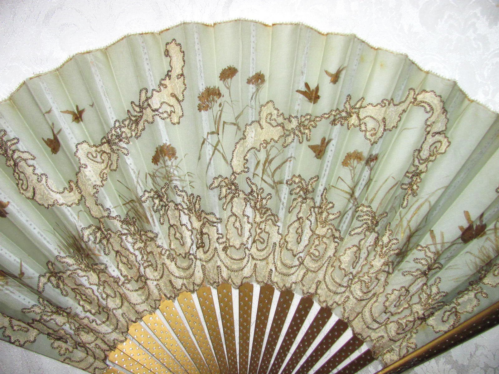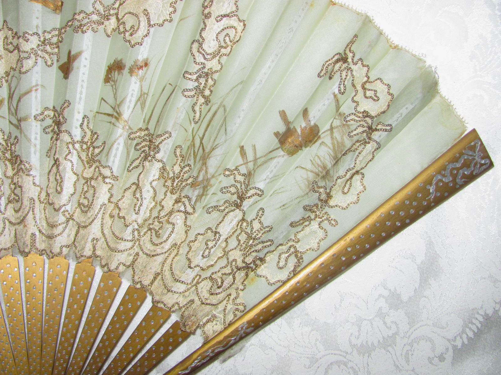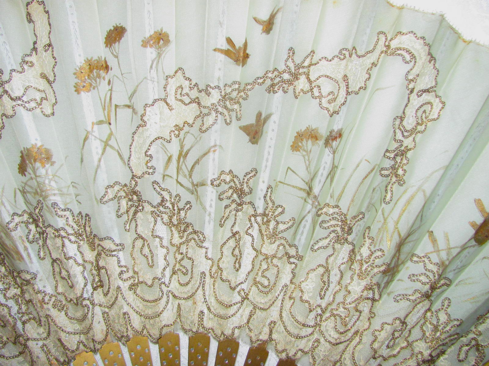 Large Antique Victorian Fan Hand Painted Silk and Lace 1890's