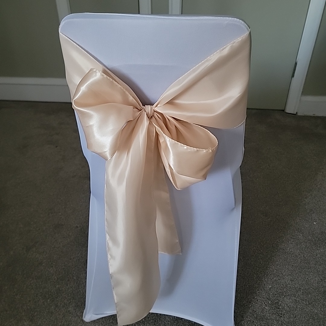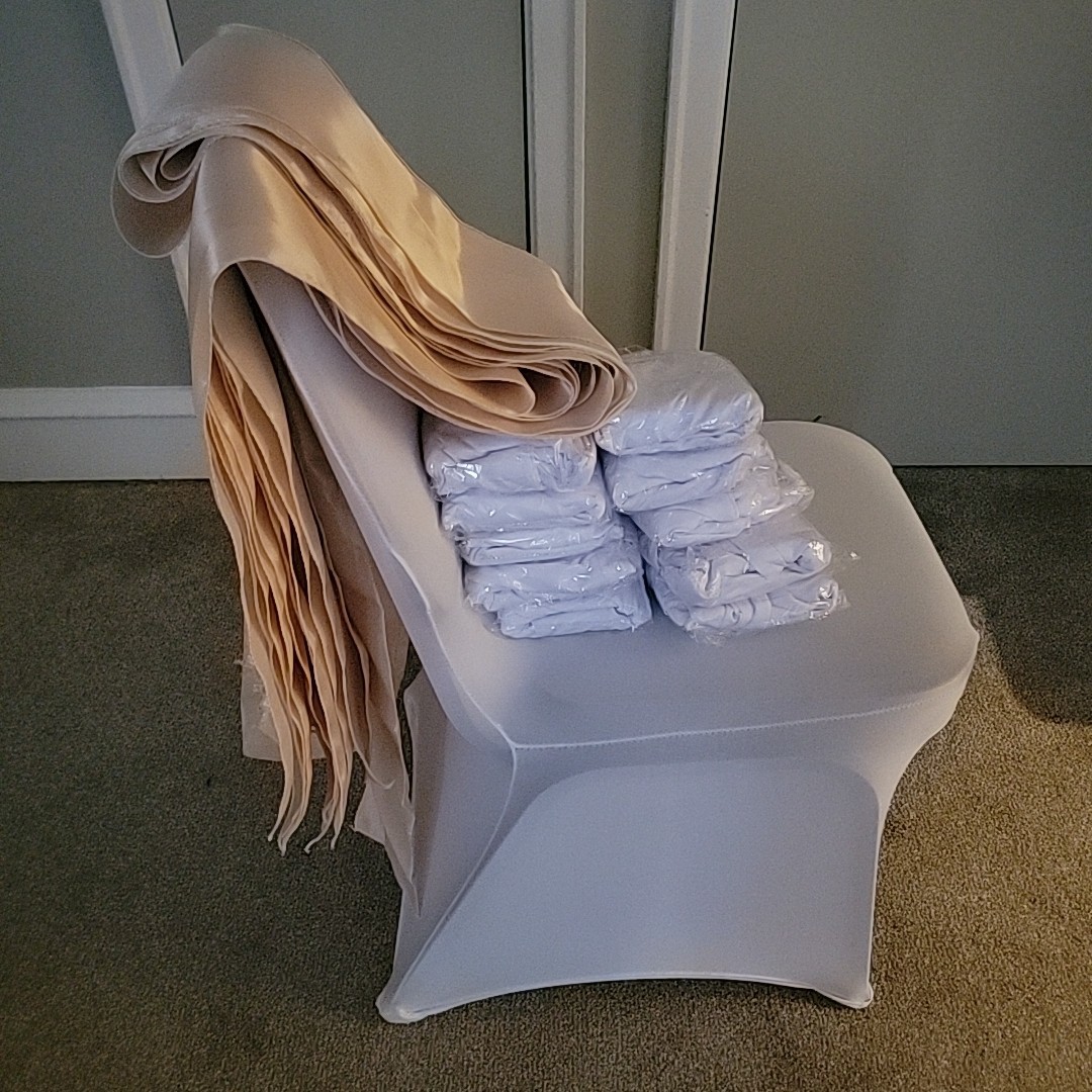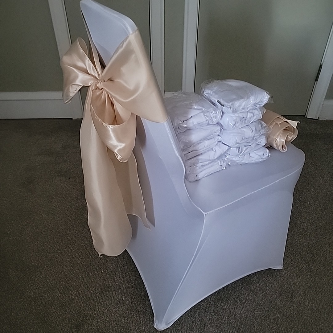 как выглядит 20 Pcs White Spandex Stretch Chair Cover Satin Sashes- Wedding Party Banquet фото