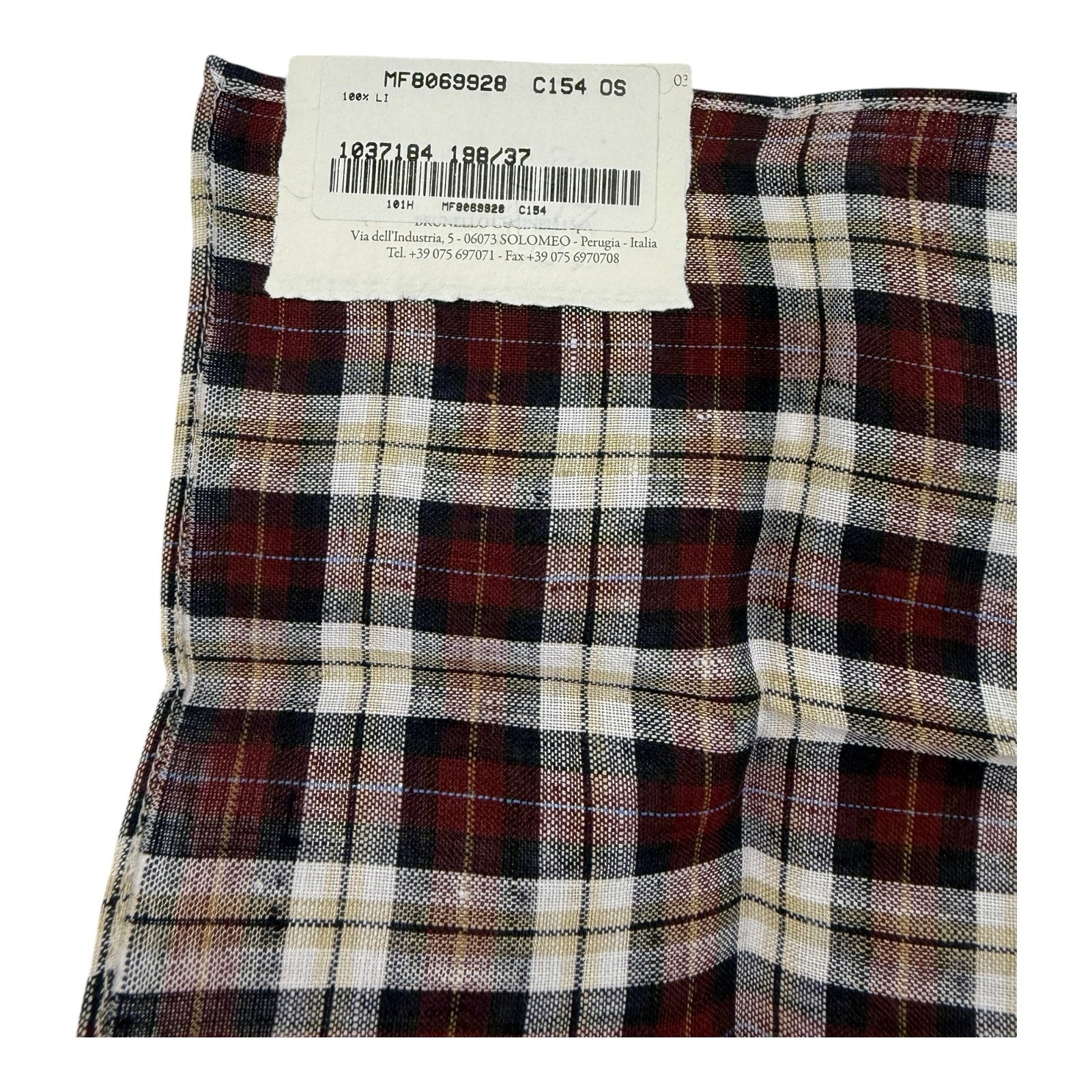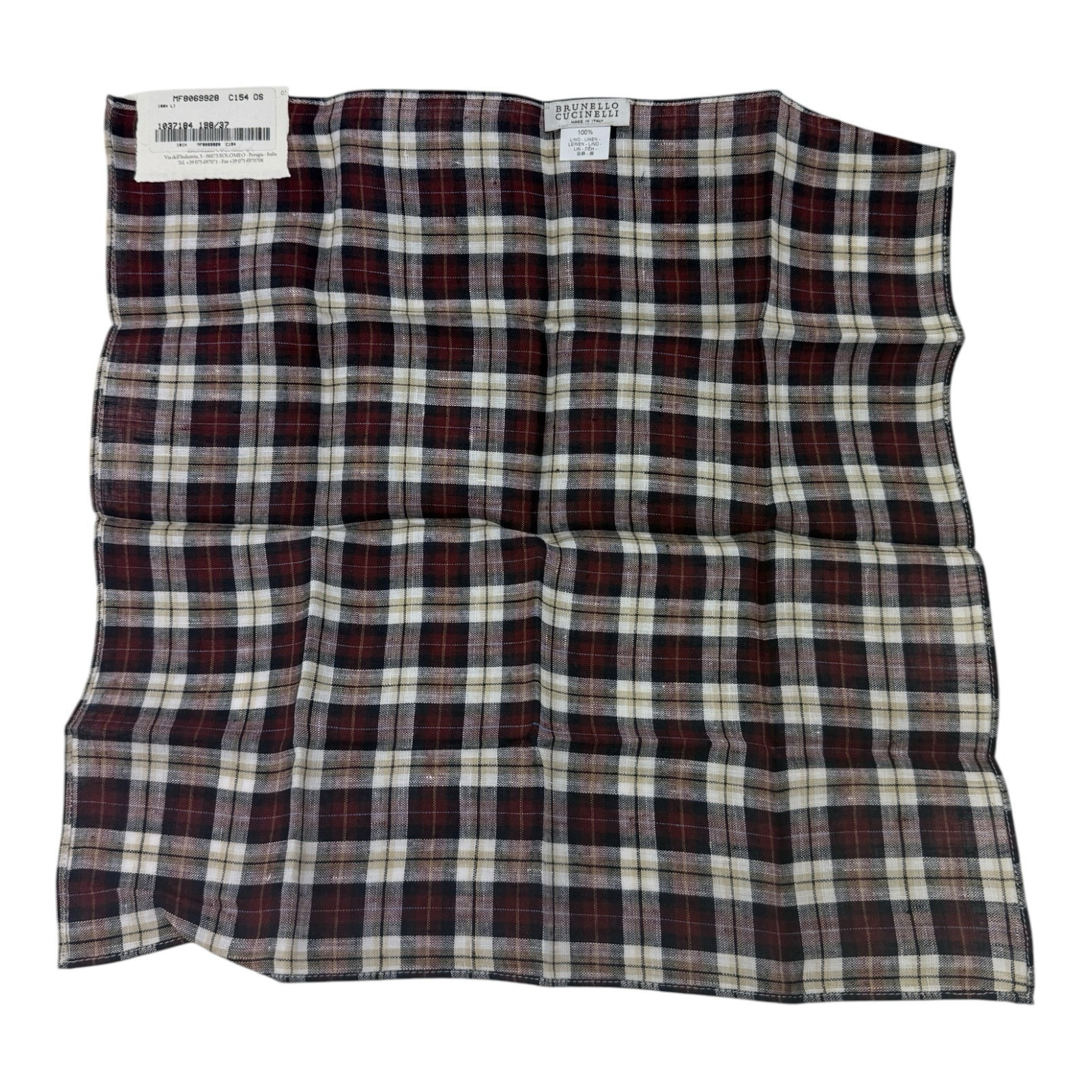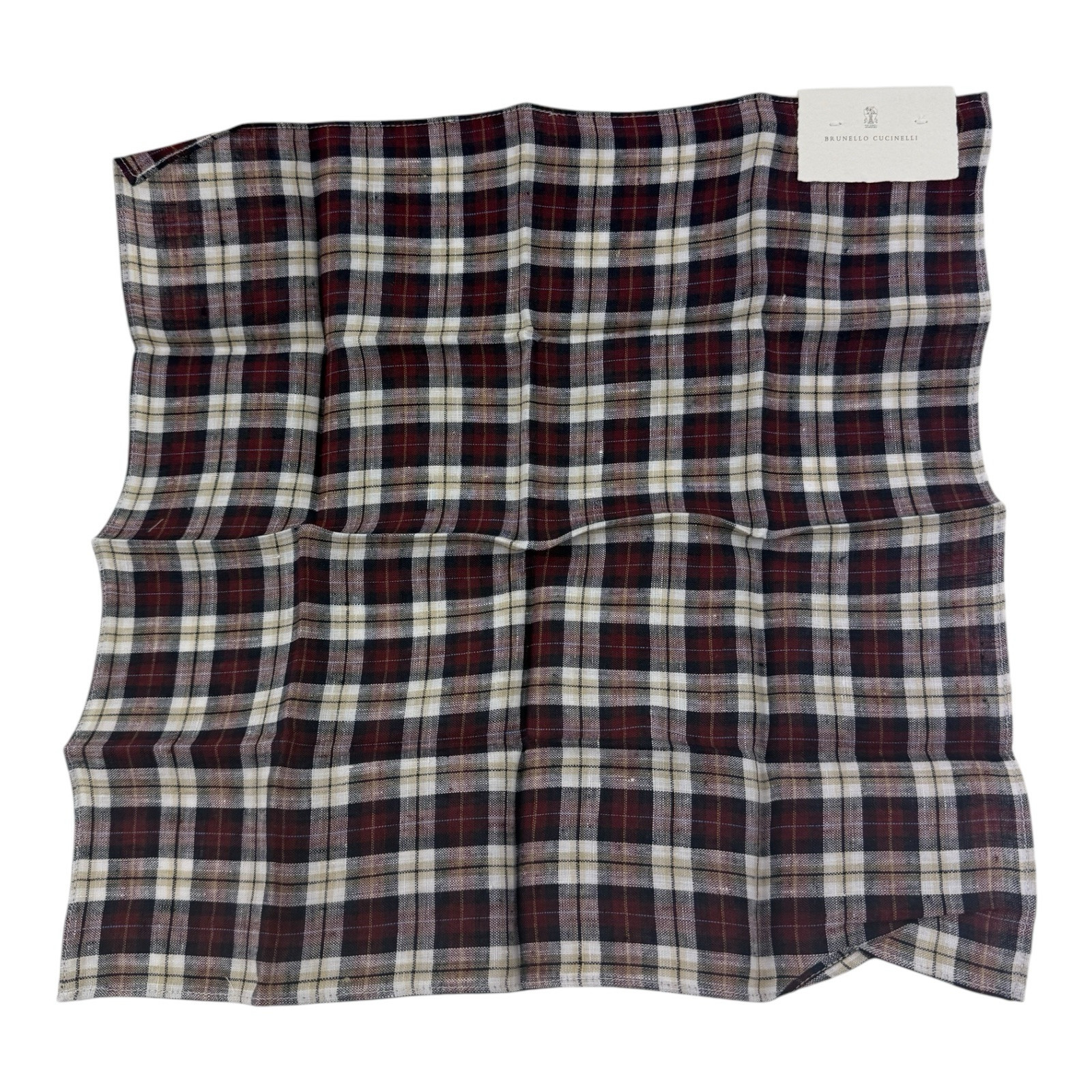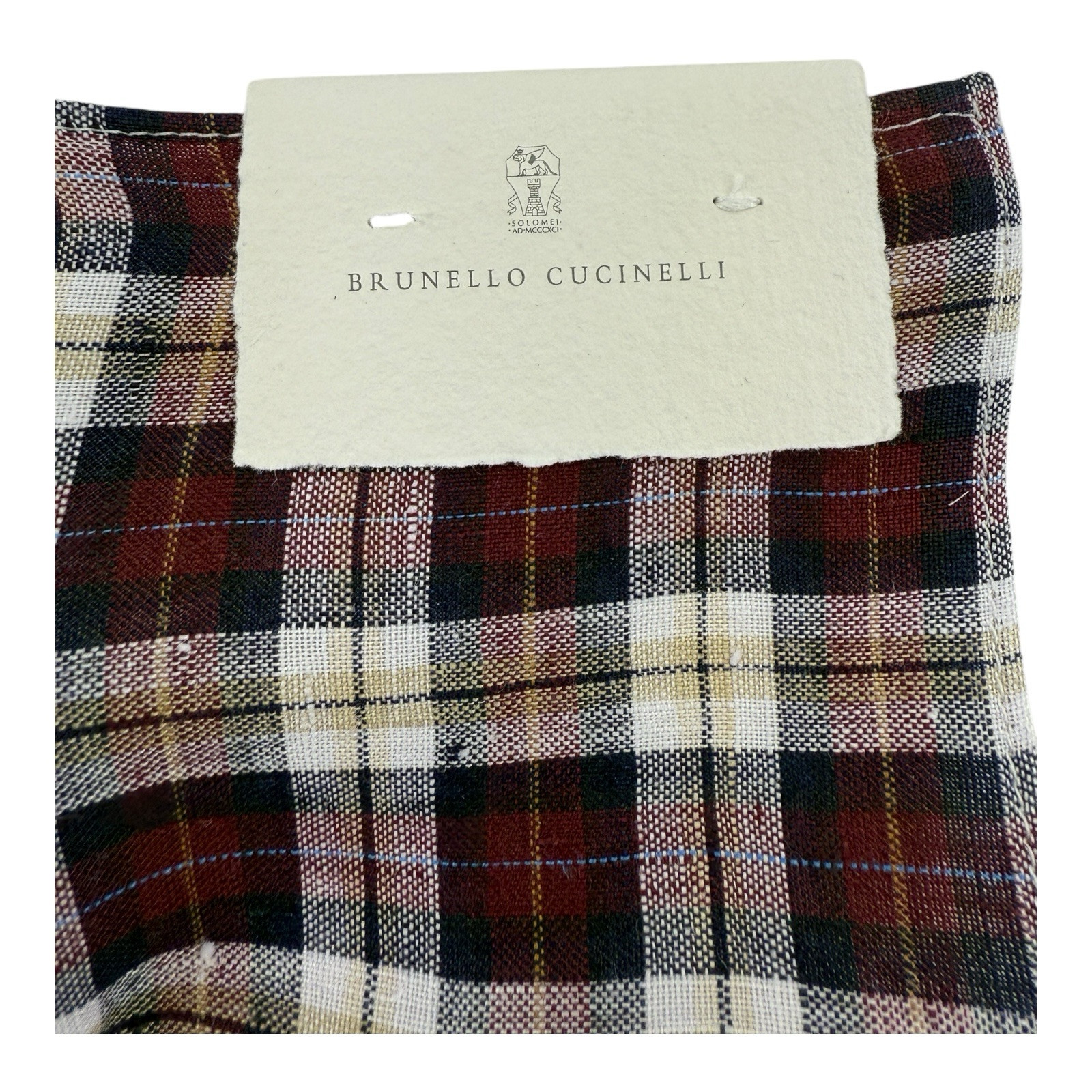 Brunello Cucinelli NWT Red Blue White Tan Plaid Pure Linen Pocket Square