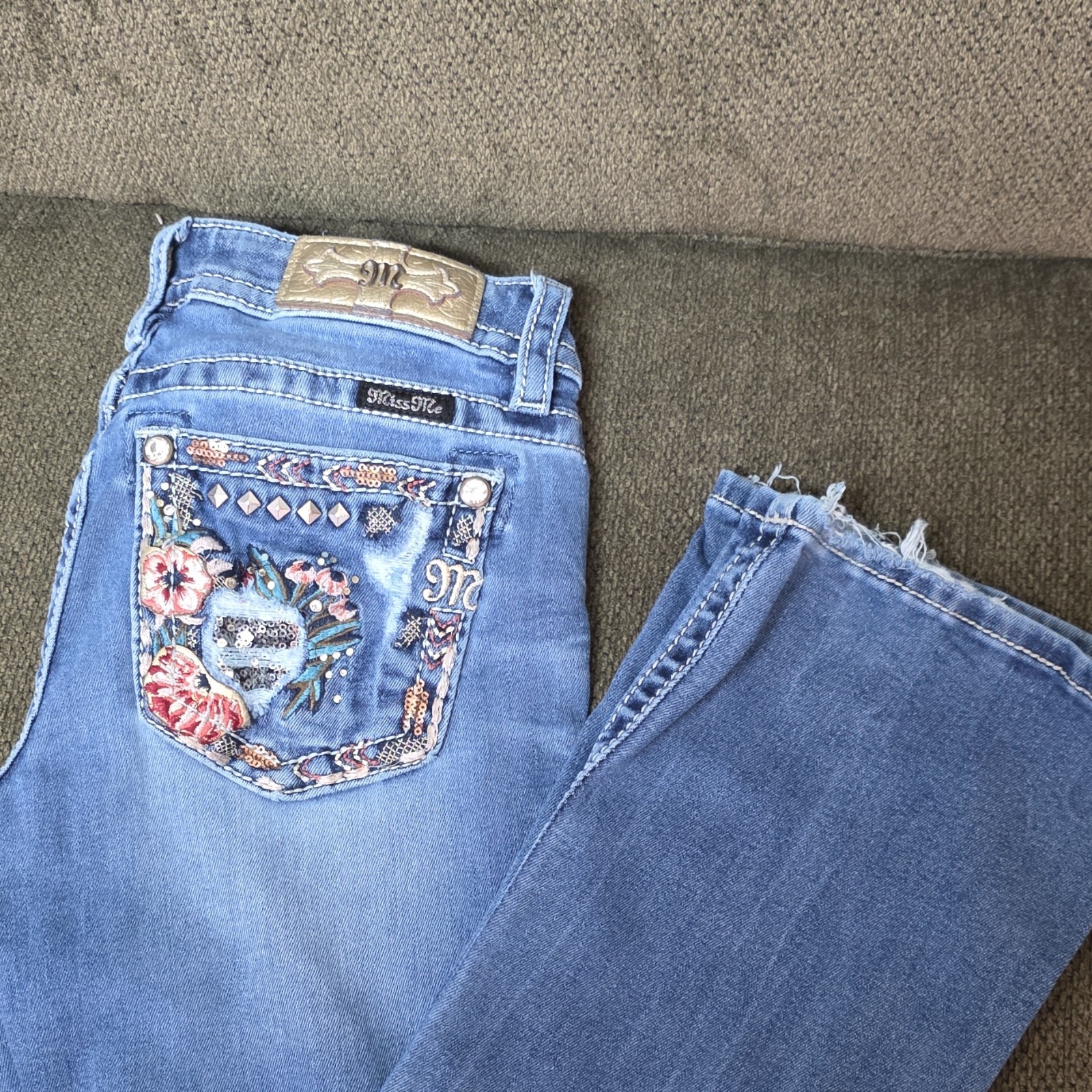 Miss Me Bootcut Blue Denim Jeans Embroidered Rhinestone Accents Women s