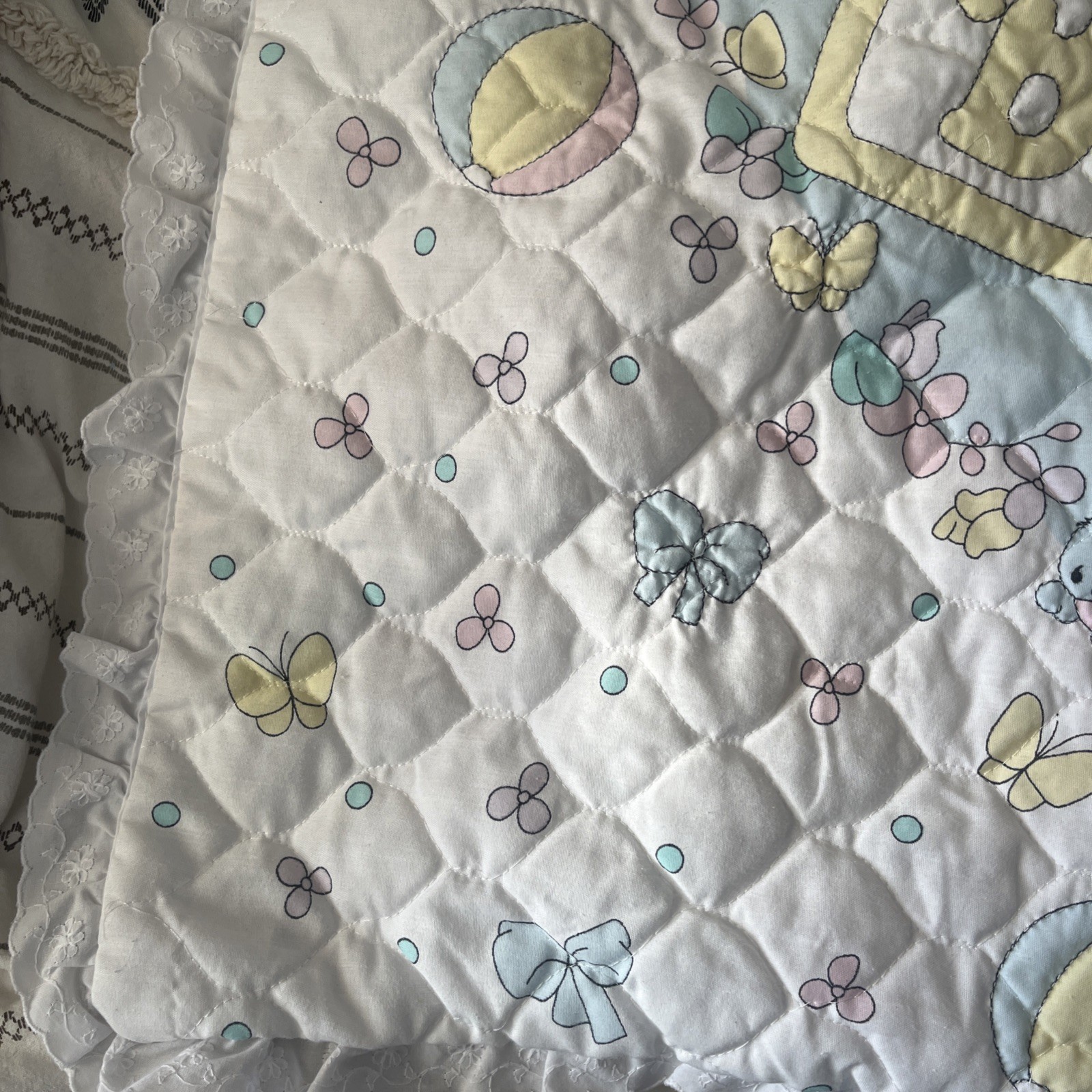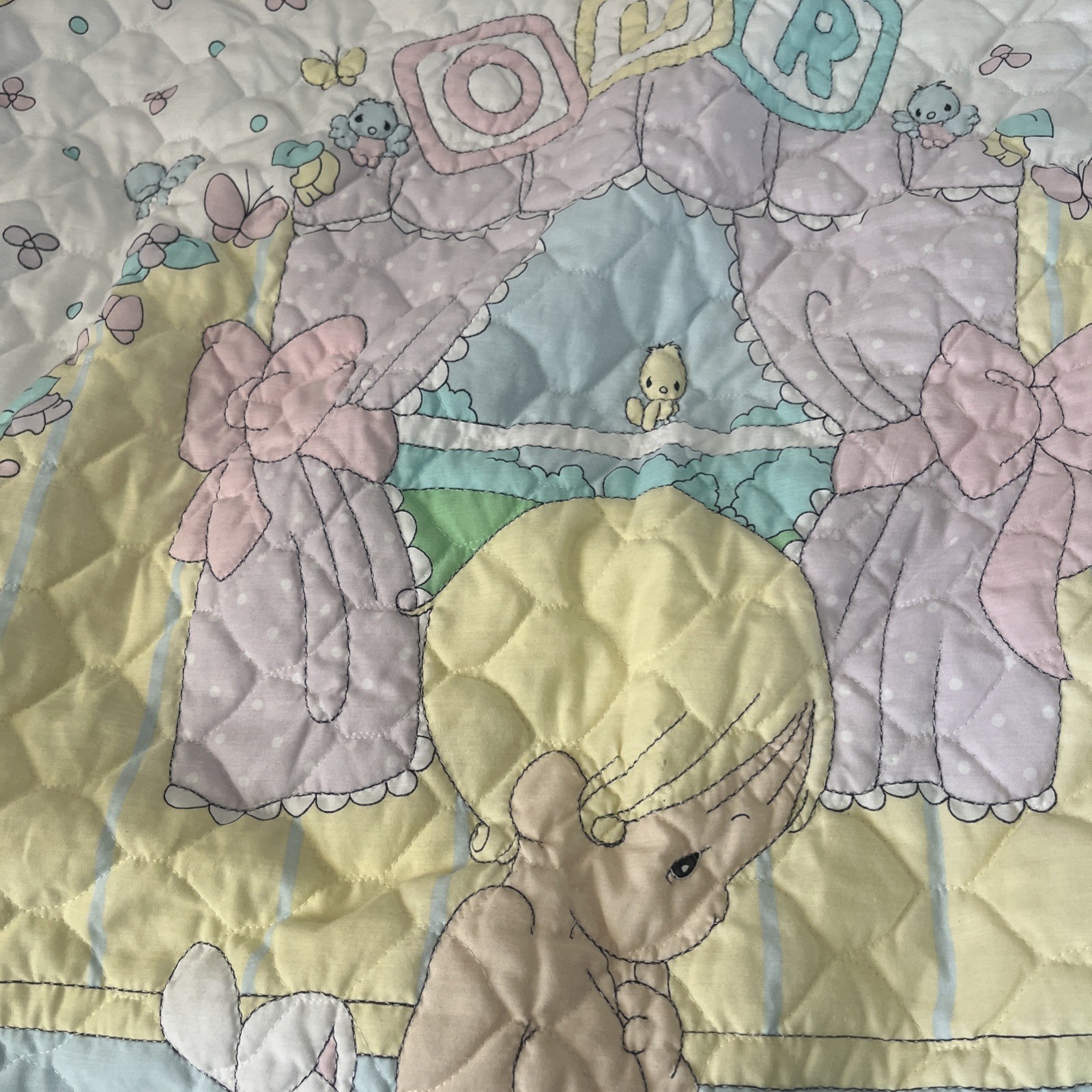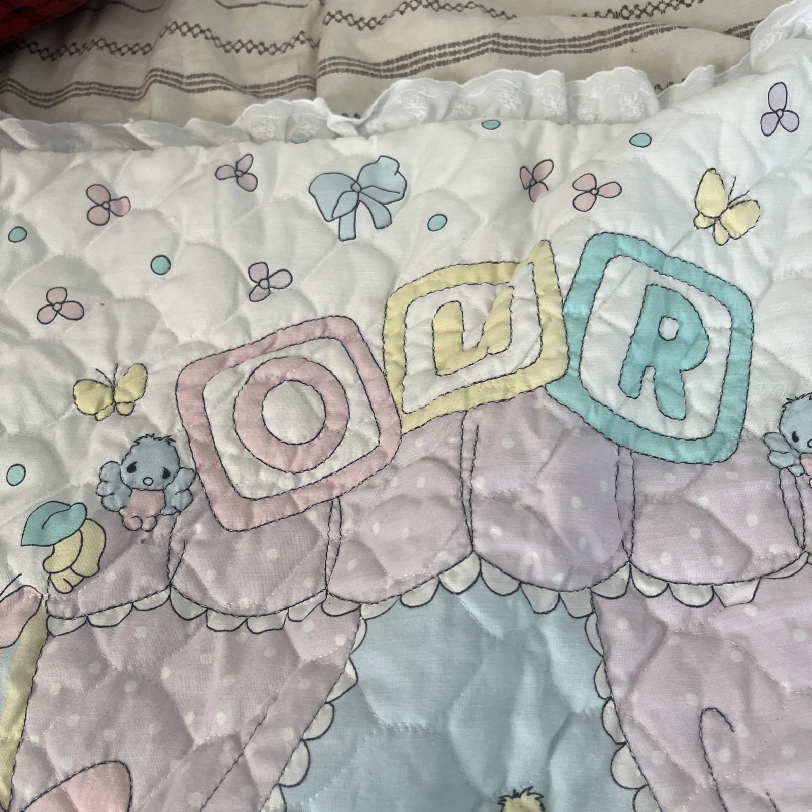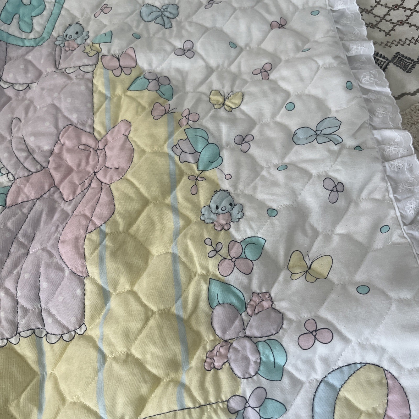 как выглядит VTG Precious Moments Our Baby Lightweight Double Sided Ruffle Quilt Blanket фото